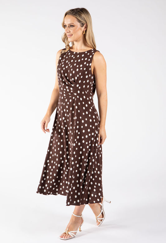 Polka Dot Sleeveless Midi Dress in Brown-White