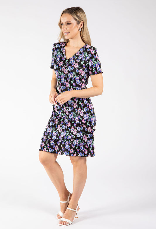 Floral Print Tiered Plisse Dress in Black Pink Blue