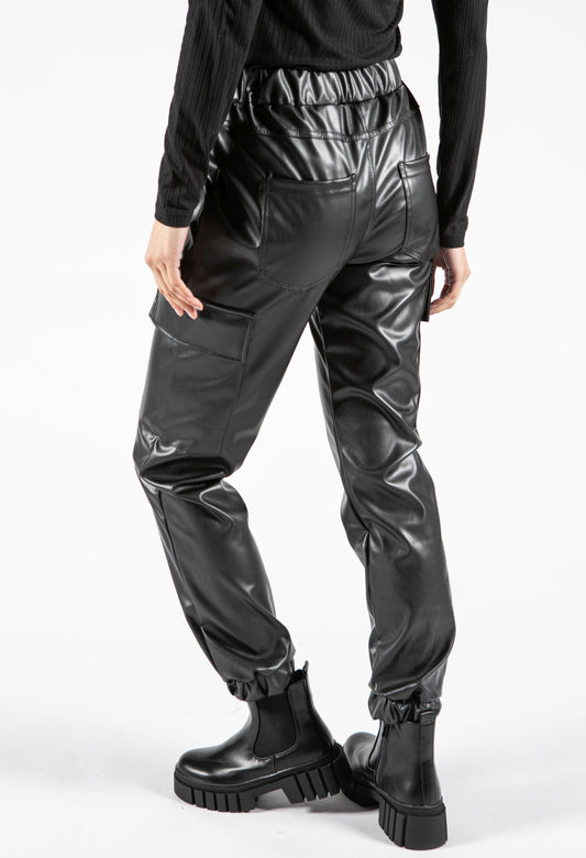 Faux Leather Cargo Style Trousers in Black