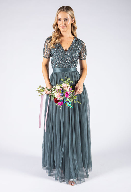Shop our huge range of bridesmaid dresses here at Pamela Scott. Finding the ideal dresses for your bridal party is a crucial part of organising your big day and we provide a variety of stylish choices to make sure your bridesmaids shine on your special day. Our range comes in various designs, colours, and styles. These include angel sleeve embellished maxi dresses with sash belts in hues like Green Lily, Taupe Blush, and Velvet Morning, as well as stripe embellished maxi dresses in Moody Lilac, Veiled Rose, and Emerald Green. We also have mini Maya stripe embellished midi dresses with bows in colours like Lotus Pink, Dusty Teal, and Berry, and sequin and tulle dresses with tie waists in shades like Dusty Teal, Misty Green, Lotus Pink, and Berry.