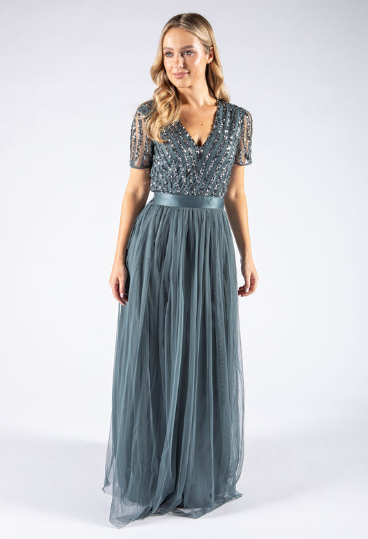 V Neck Sequin and Tulle Dress with Tie Waist in Dusty Teal