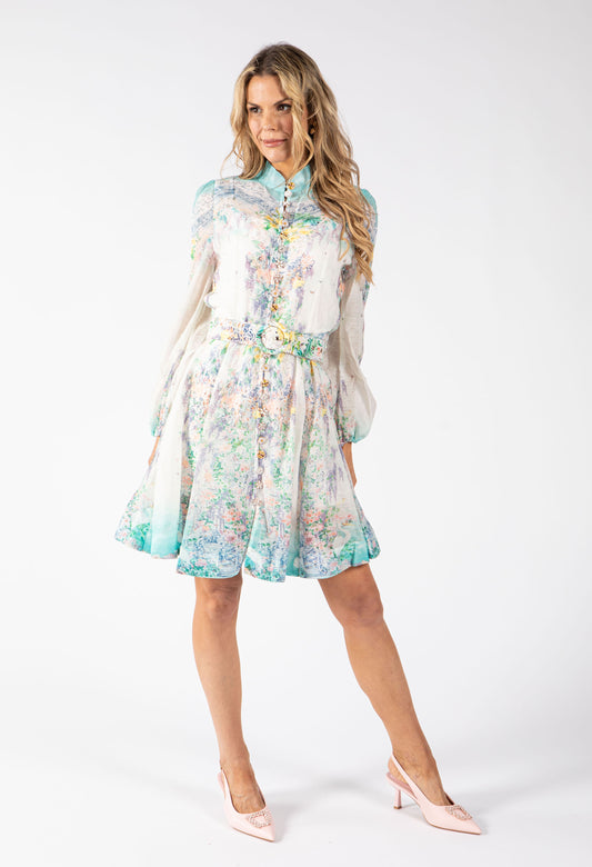 Floral Print Belted Short Dress in Aqua