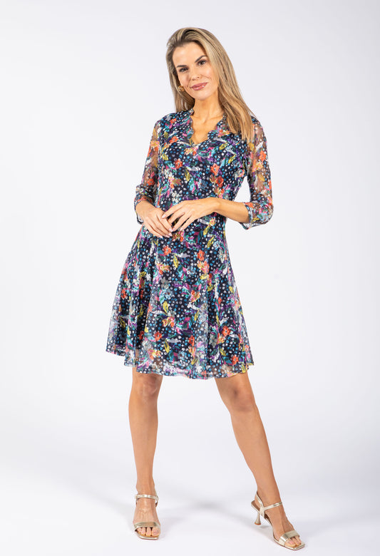 Scalloped Neck Floral Lace Dress in Navy Mix