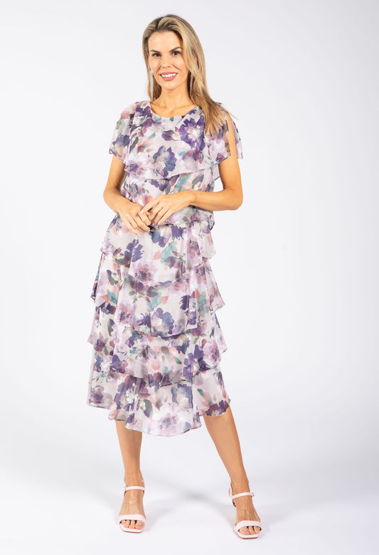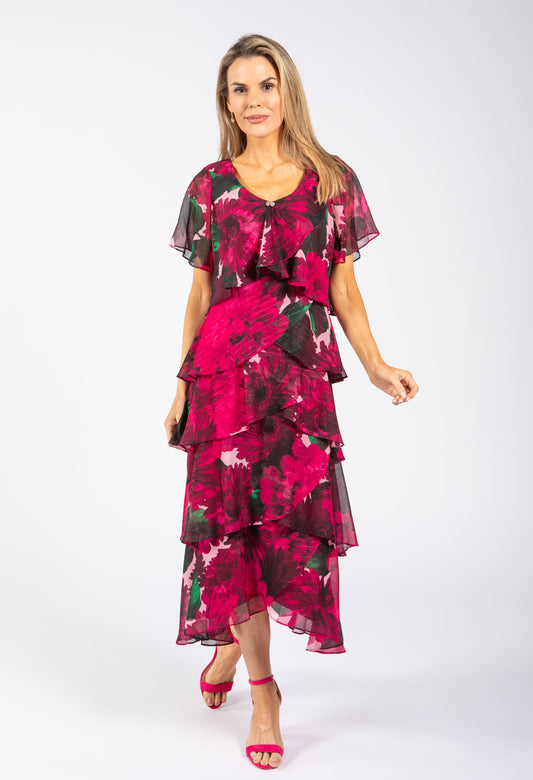 Floral Chiffon Midi Dress in Fushia Mix