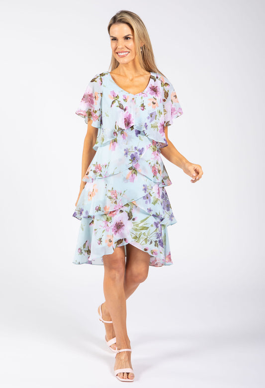 Floral Print Chiffon Short Dress in Blue Multi