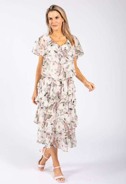 Floral Chiffon Midi Dress in Taupe Mix