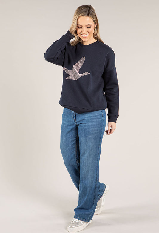 Stripe Gold Button Polo Sweatshirt in Navy/Beige