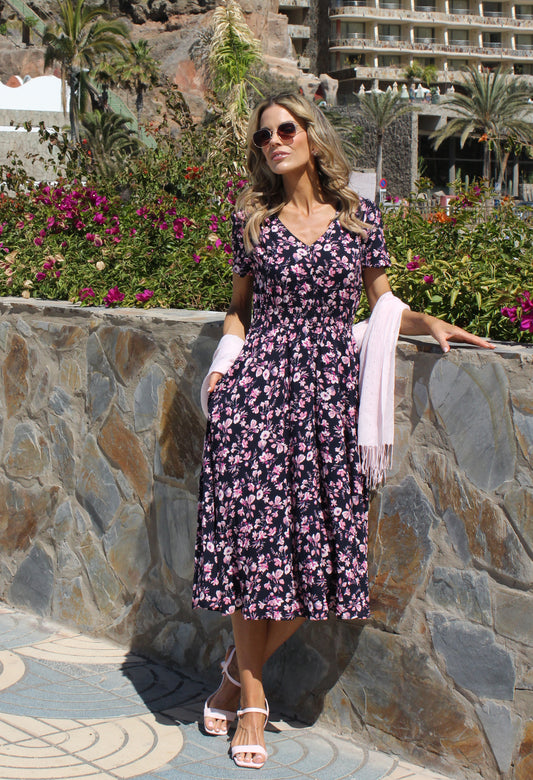 Floral Print V-Neck Midi Dress in Navy Mix