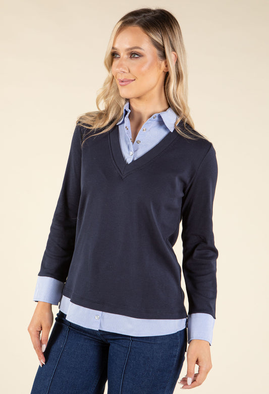 2 in 1 Pinstripe Shirt Top in Navy/Blue