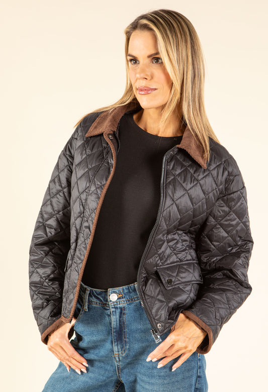 Corduroy Trim Quilted Jacket in Black