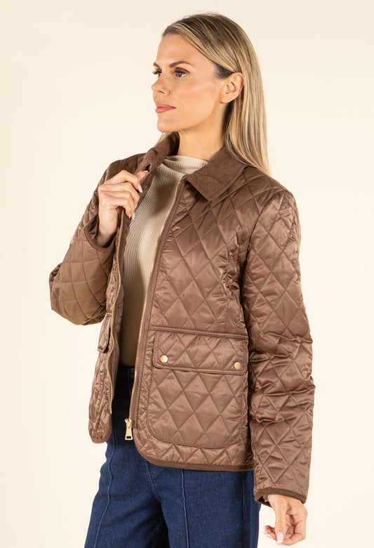 Corduroy Trim Quilted Jacket in Brown