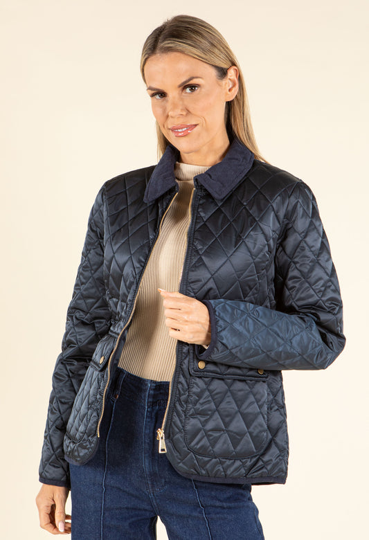 Corduroy Trim Quilted Jacket in Navy