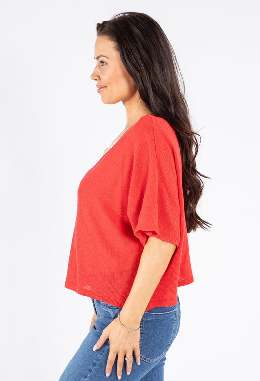 V-Neck Cropped Knit Cardigan in Red