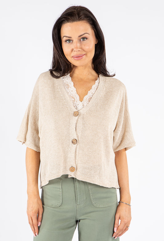 V-Neck Cropped Knit Cardigan in Beige