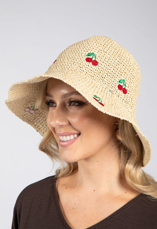 Cherry Detail Straw Hat in Beige