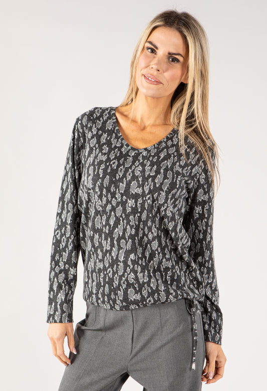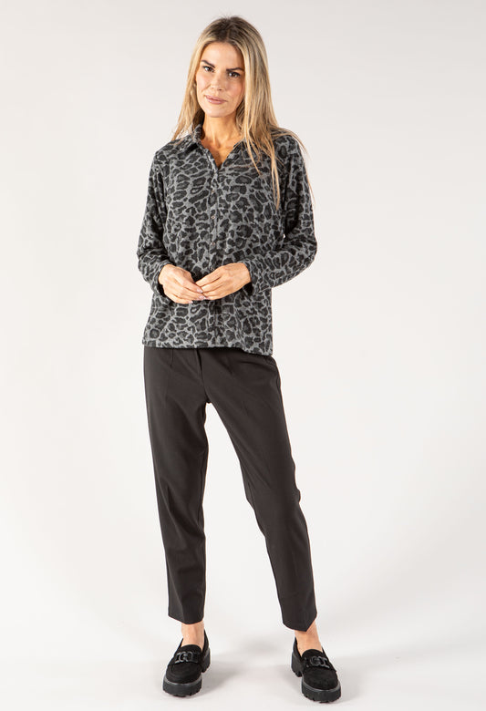Leo Print Button Down Soft Knit Top in Dark Grey