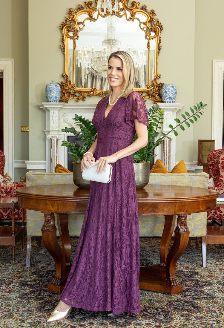 Lace V-Neck Angel Sleeve Maxi Dress in Berry