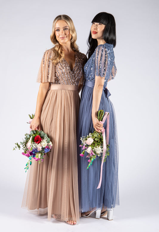ANGEL SLEEVE EMBELLISHED MAXI DRESS WITH SASH BELT in Taupe Blush