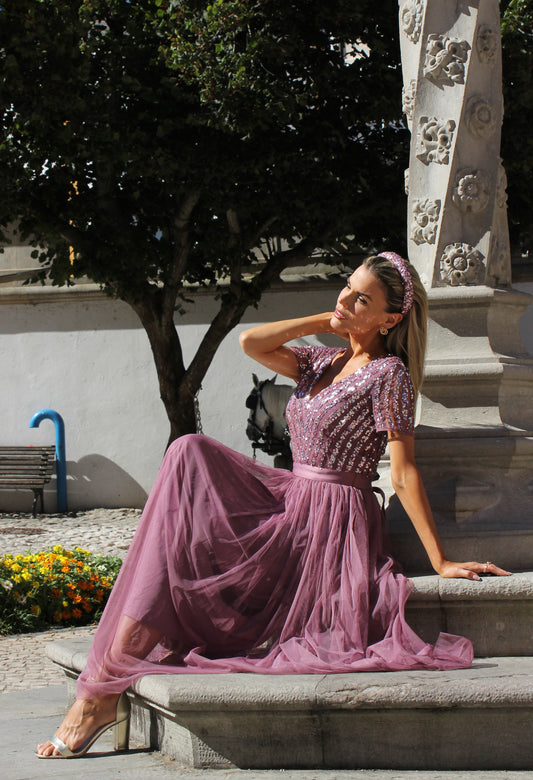 Lotus Pink V NECK SEQUIN AND TULLE DRESS WITH TIE WAIST in Lotus Pink