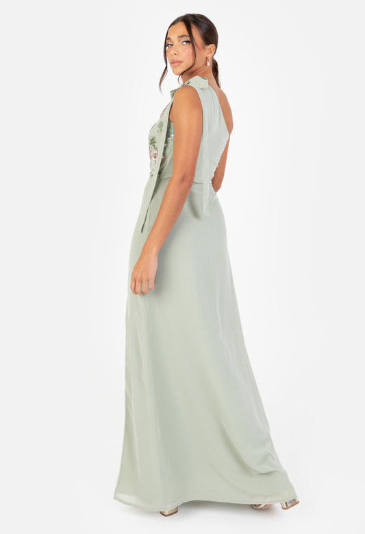 Sage Green Floral Embroidered Cowl Back Maxi Dress in Green Lily
