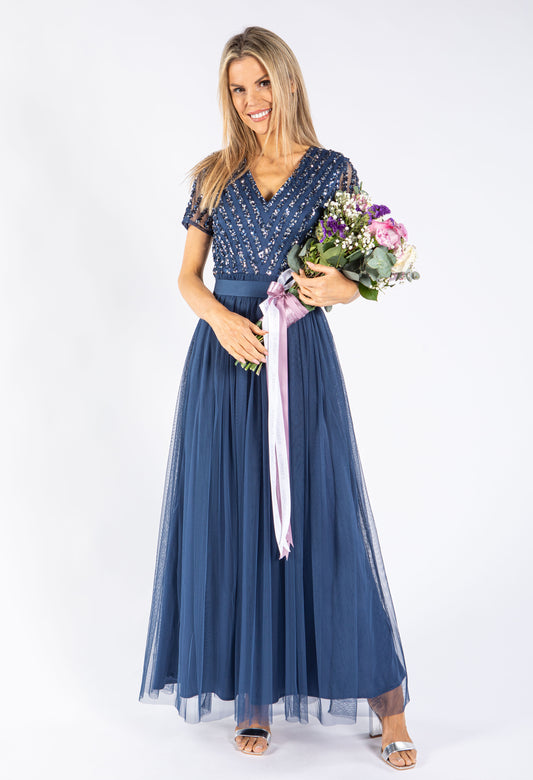 Maya Embellished Maxi Dress With Sash Belt in Dusty Blue