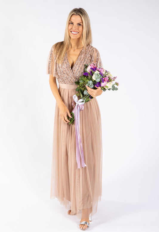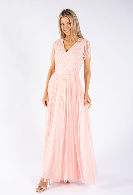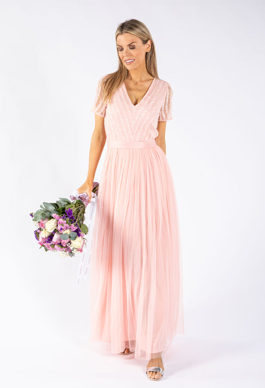 Maya Embellished Maxi Dress With Sash Belt in Frosted Pink