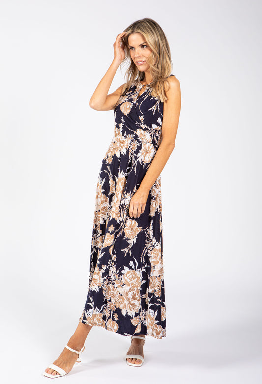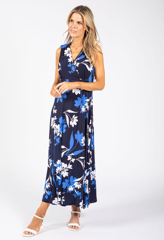 Sleeveless Floral Wrap Dress in Navy/Ivory