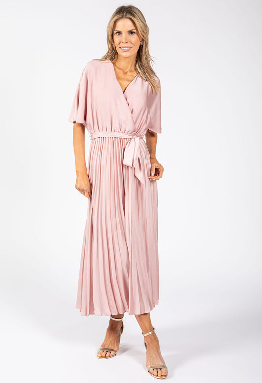 Plisse Pleated Wrap Midi Dress in Pink