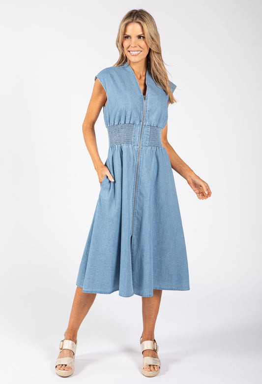 Denim Zip-Up Midi Dress