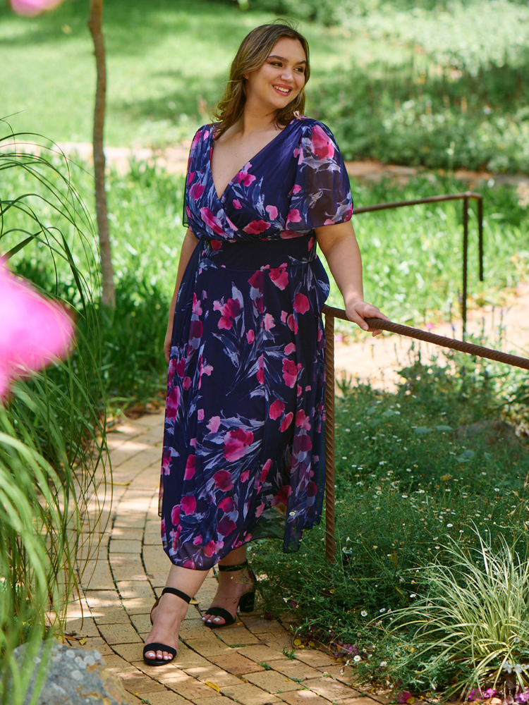 Victoria Angel Sleeve Mesh Midi Curve+ Dress in Navy Flower