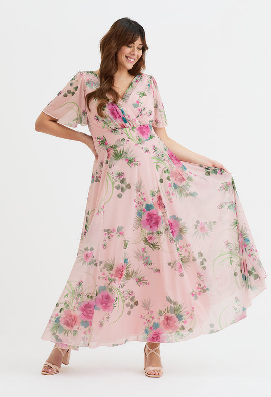 Victoria Angel Sleeve Mesh Midi Curve+ Dress in Black Flower