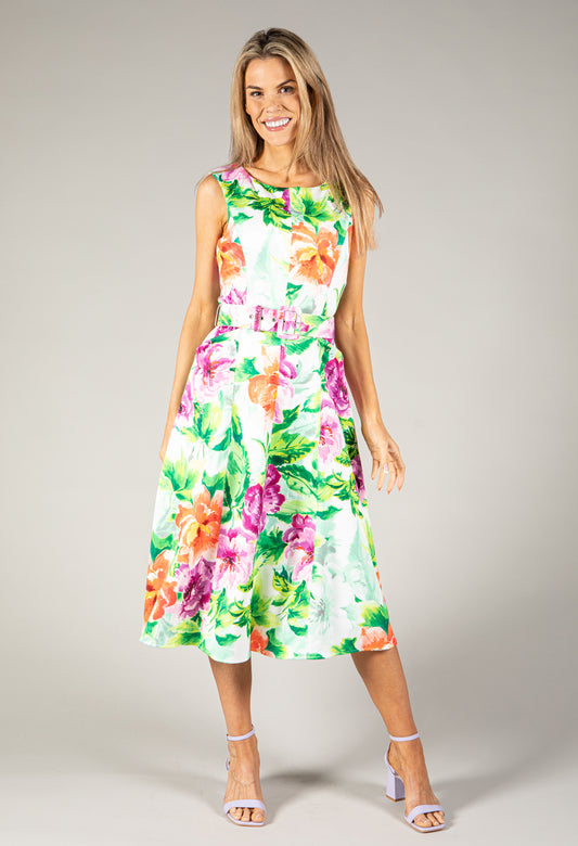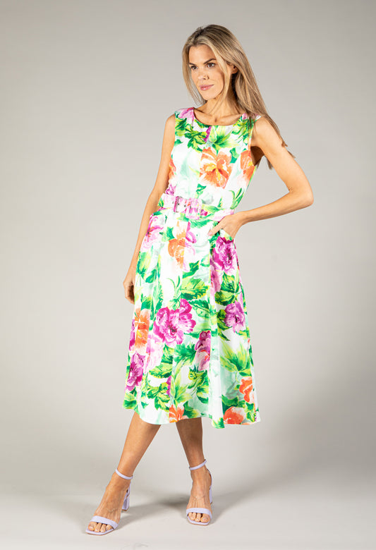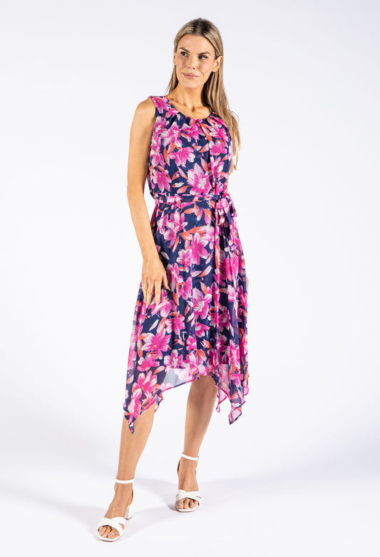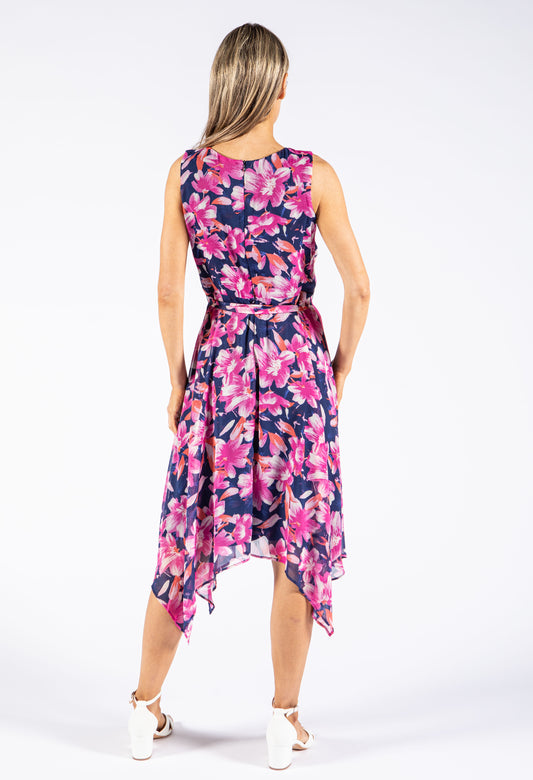 V-Neck Faux-Wrap Midi Dress in Pink Mix