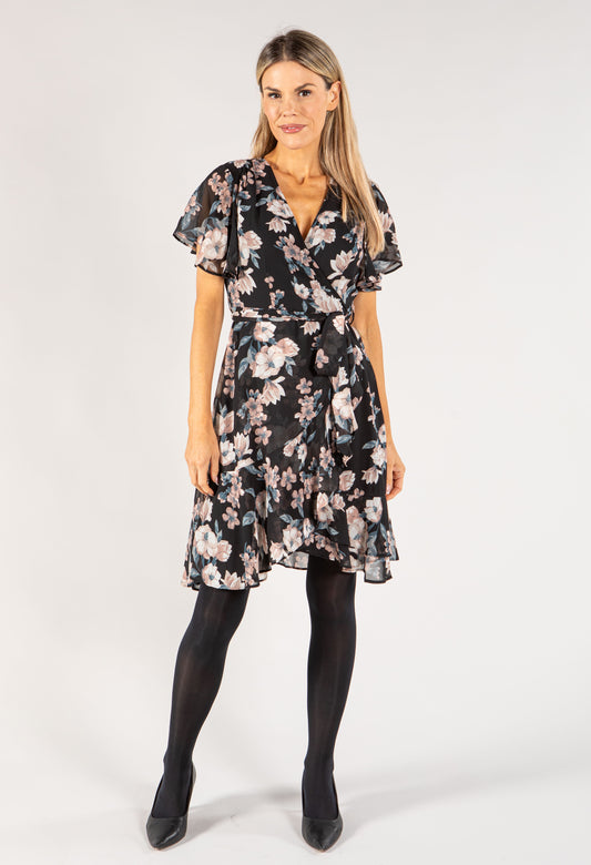Victoria Angel Sleeve Mesh Midi Curve+ Dress in Black Flower