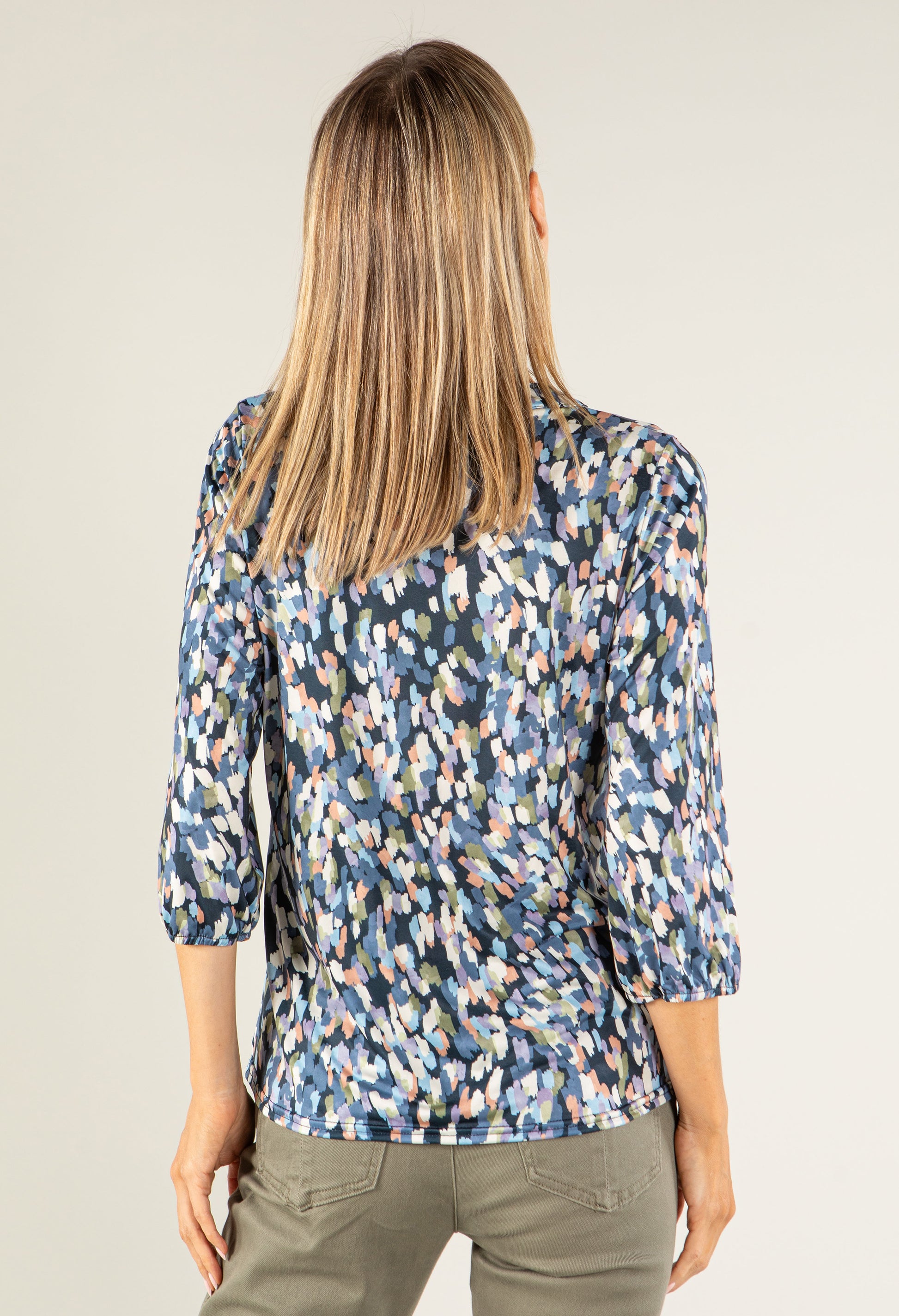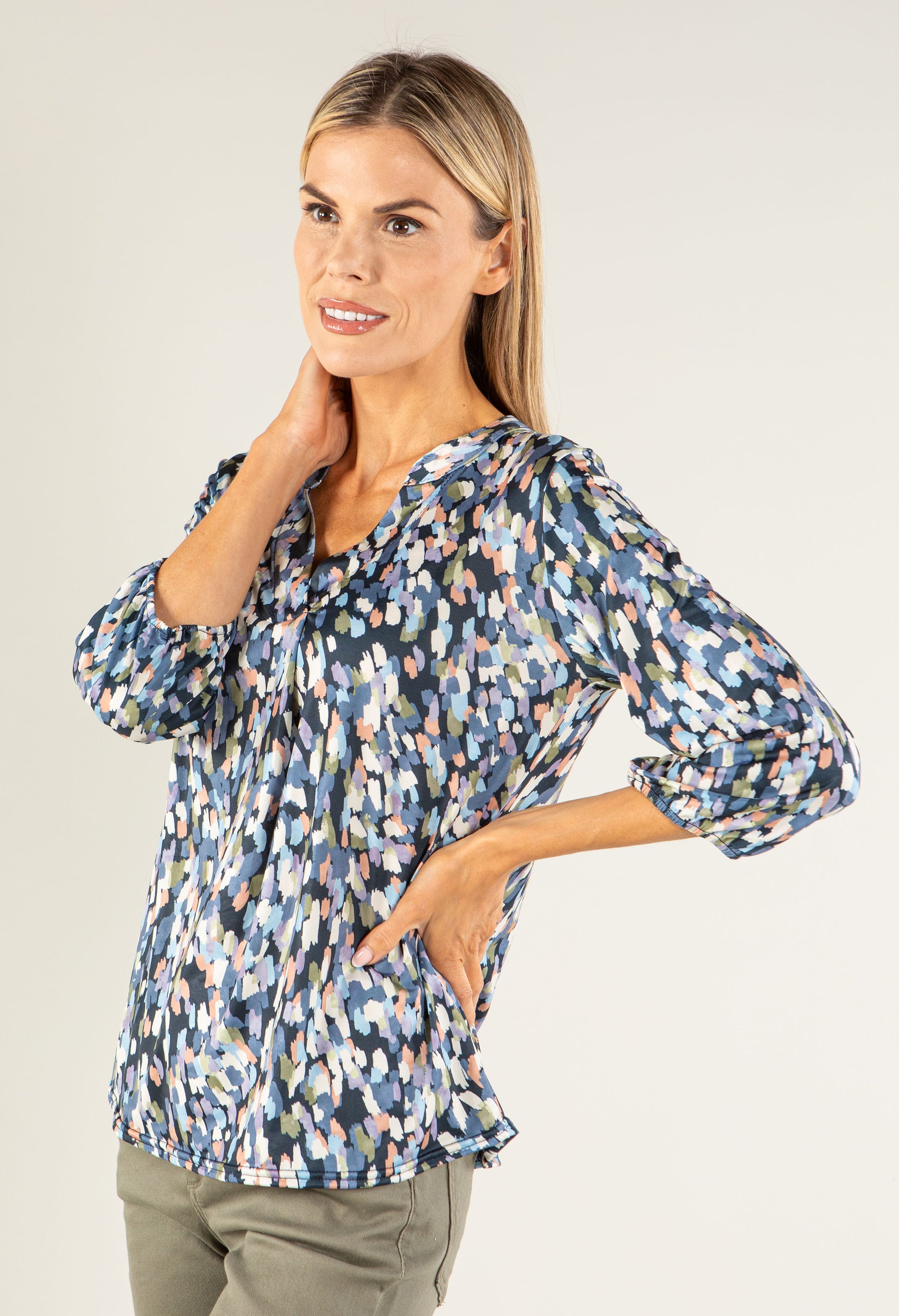 This Abstract Print V-Neck Top offers a stylish V-neckline and comfortable stretch fabric. It features elasticated cuffs and 3/4 length sleeves, all highlighted by a striking abstract print for a contemporary finish.