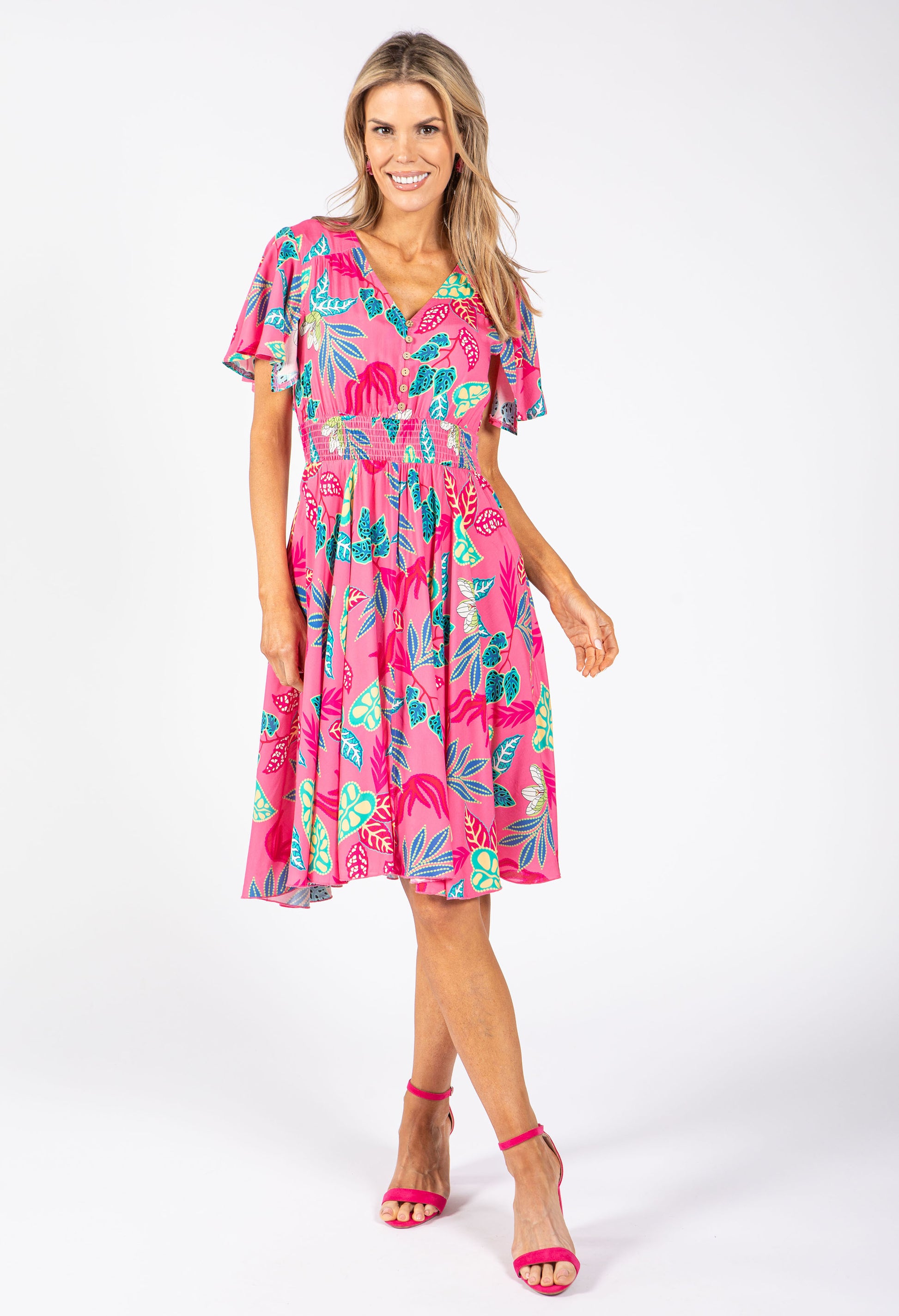 Celebrate natural beauty with this leaf print dress featuring delicate angel sleeves and a flattering V-neckline. The elasticated waistband provides a subtle slimming effect, while side pockets add practical convenience. A half button closure and knee length silhouette make this versatile piece perfect for any occasion.