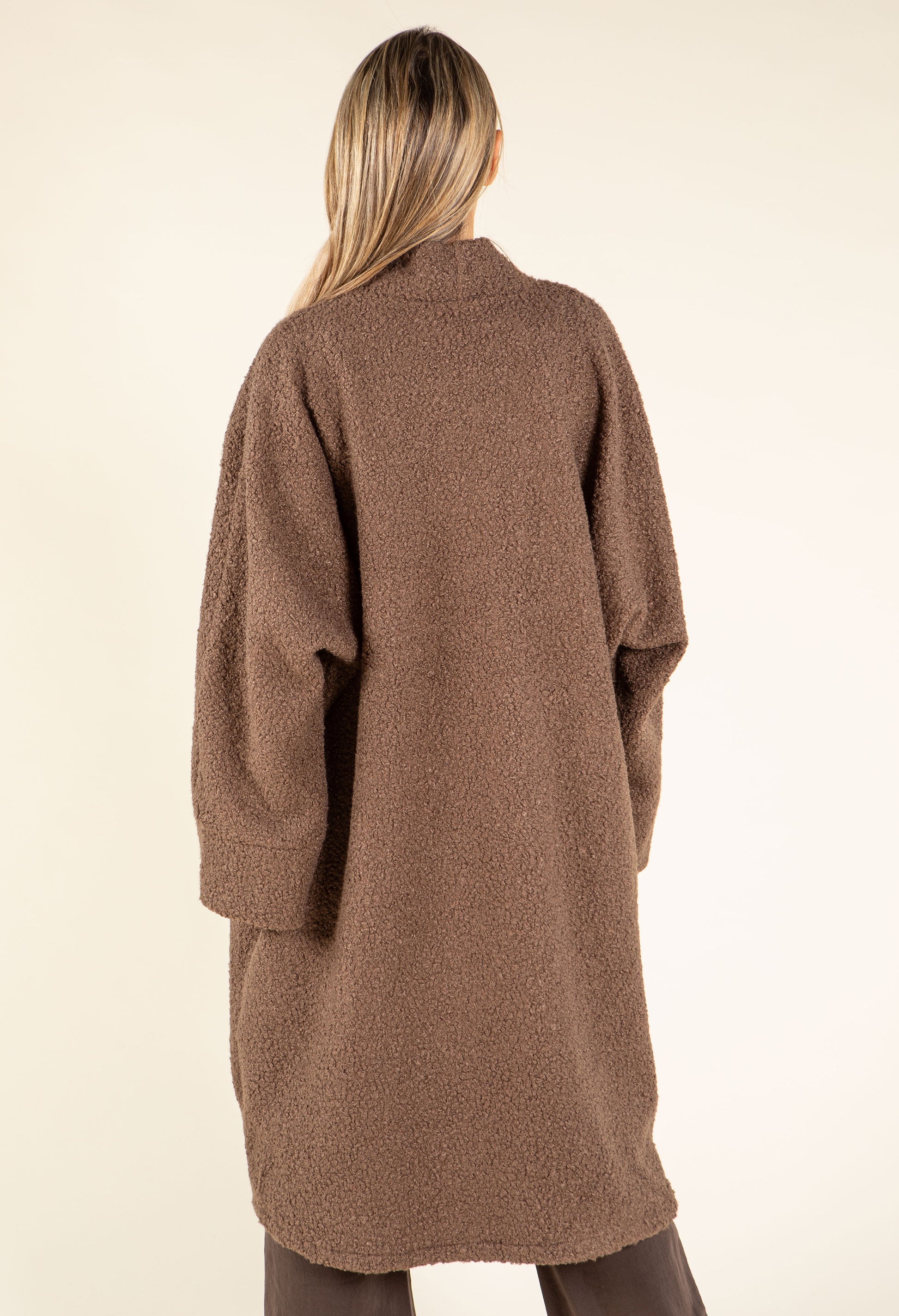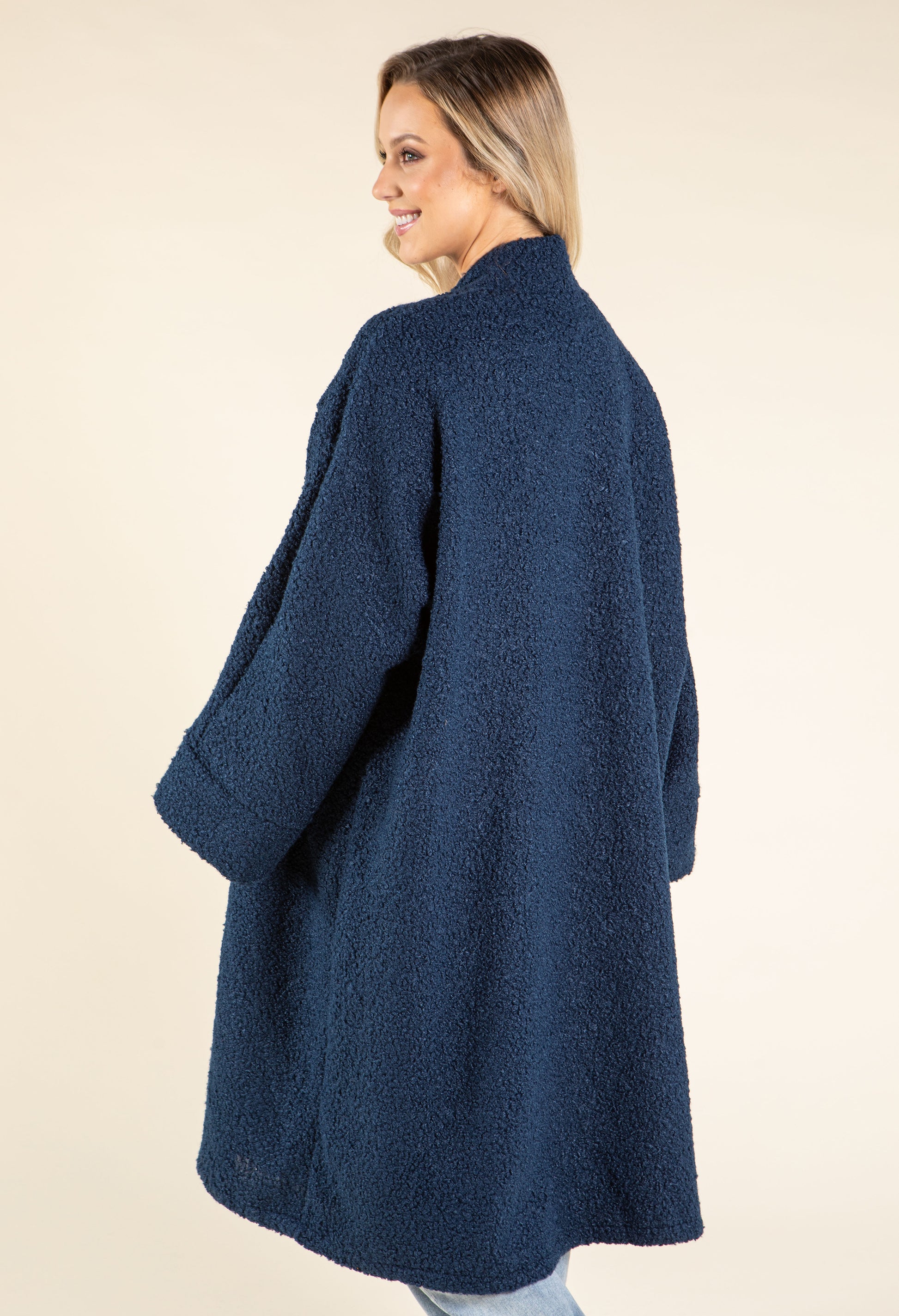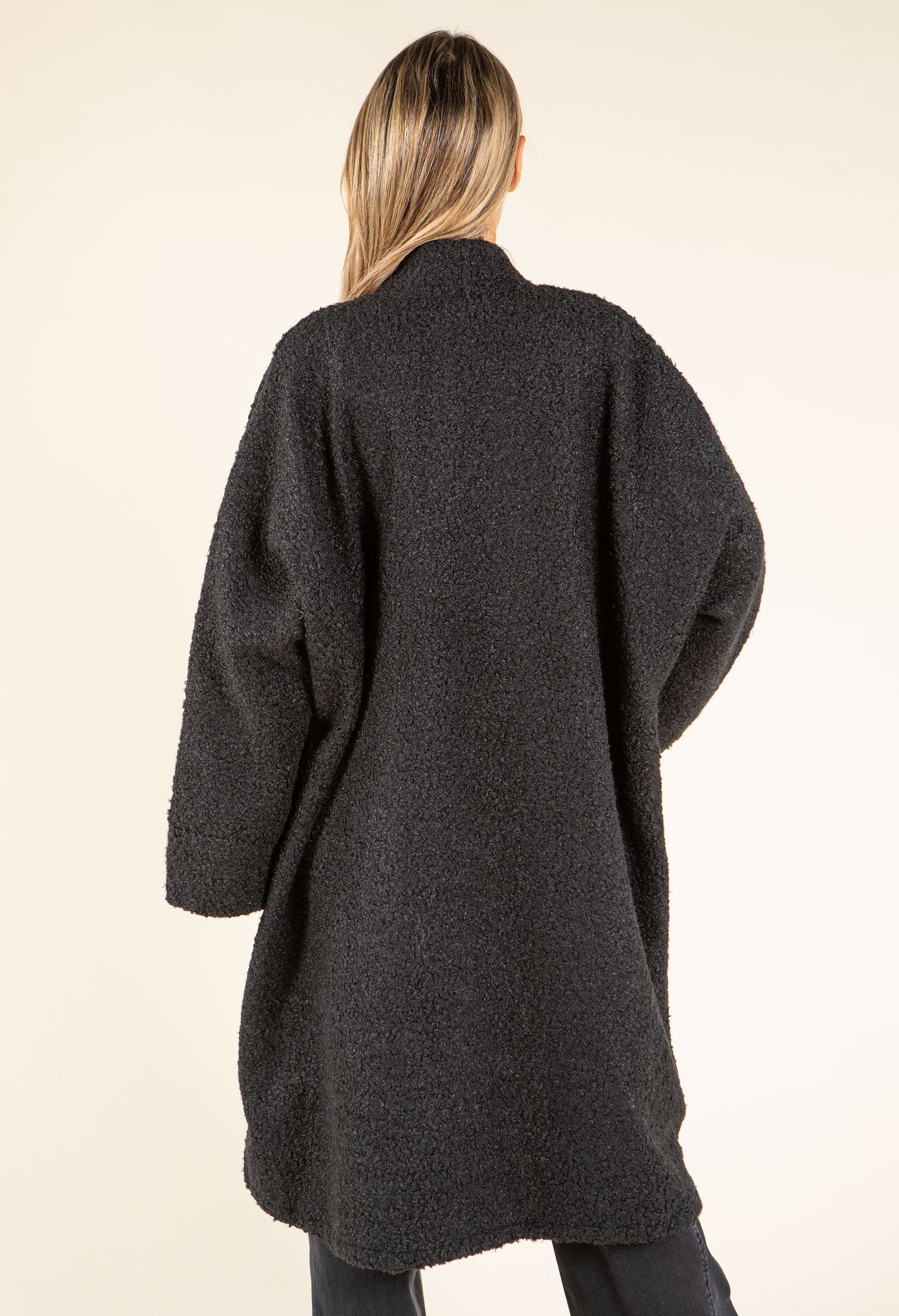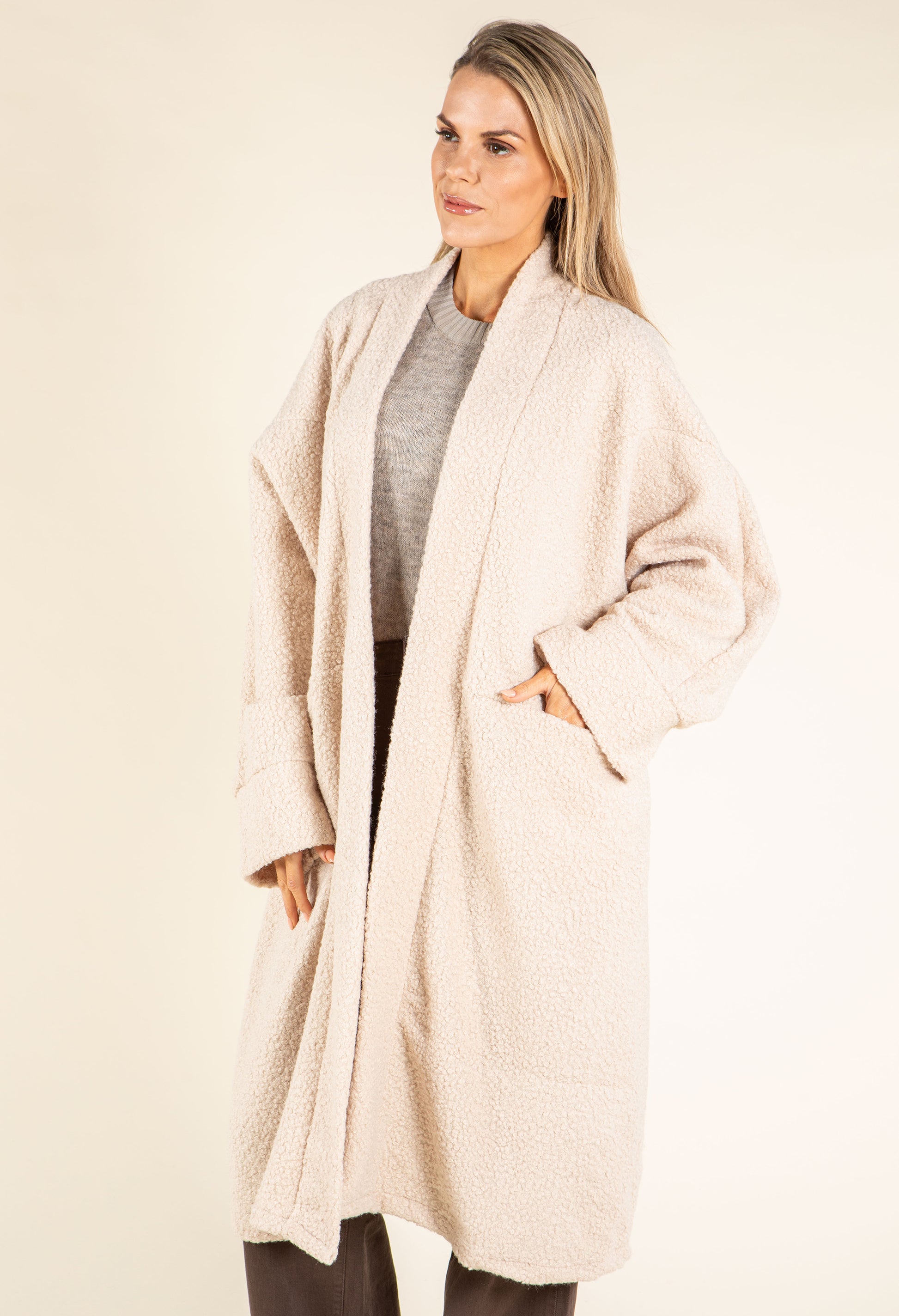 The Charlotte Soft Boucle Coatigan showcases an open-front design complemented by convenient side pockets. Its longline silhouette and long sleeves provide extra coverage, while the soft-touch boucle fabric delivers comfort and style effortlessly.