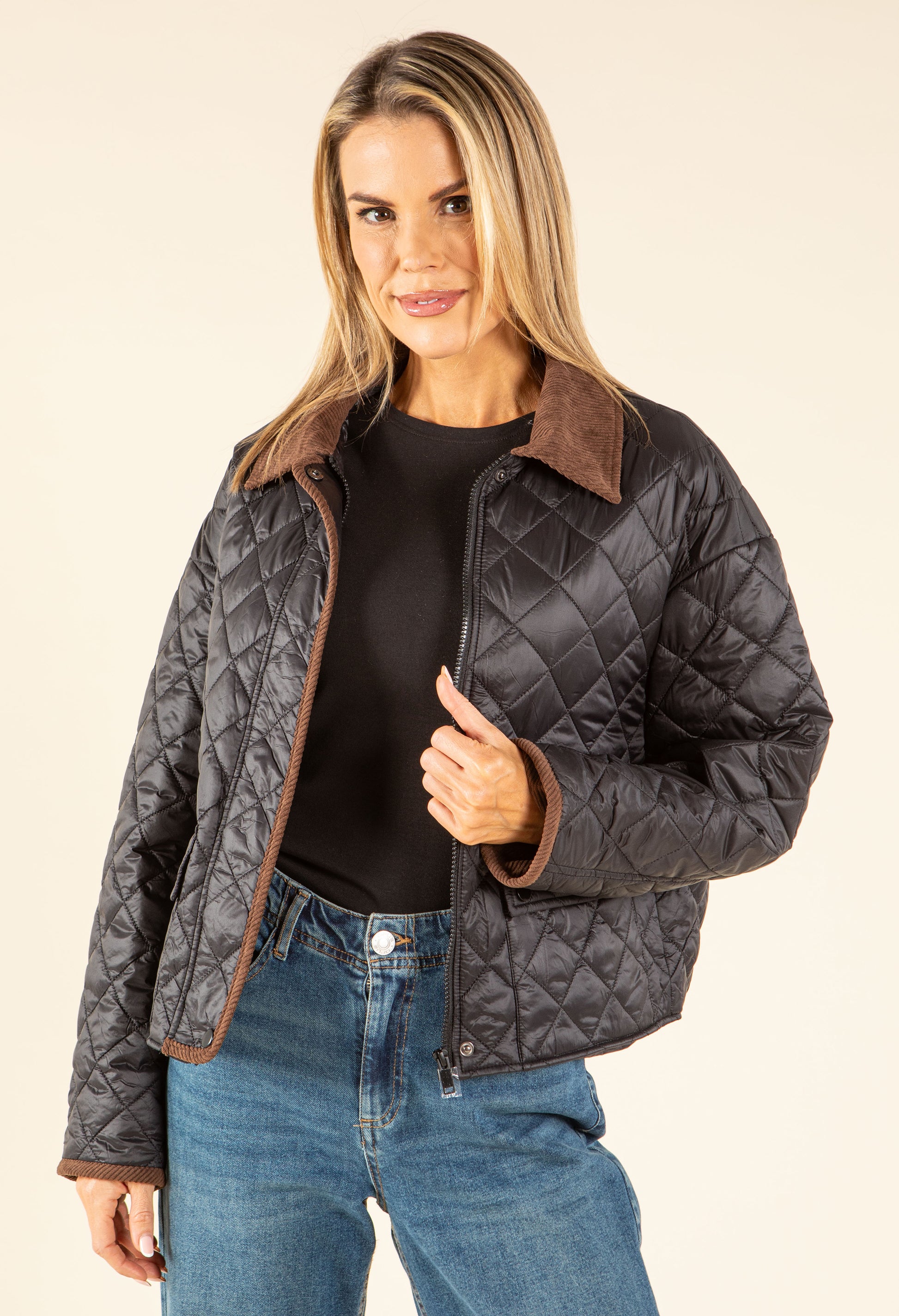 This lightweight quilted jacket features corduroy trim and two front patch pockets. It has long sleeves and a combined button and zip closure for a polished, sophisticated finish.