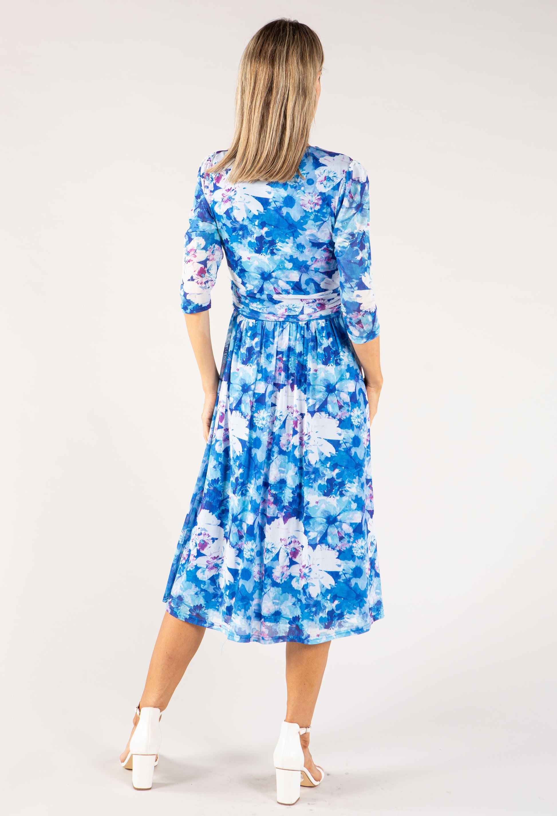 This Floral Print Mesh Wrap Dress features a V-Neckline and Midi Length, as well as convenient Side Pockets and Sheer 3/4 Length Sleeves. The Mesh Material is fully lined for comfort and the dress is adorned with a lovely Floral Print.