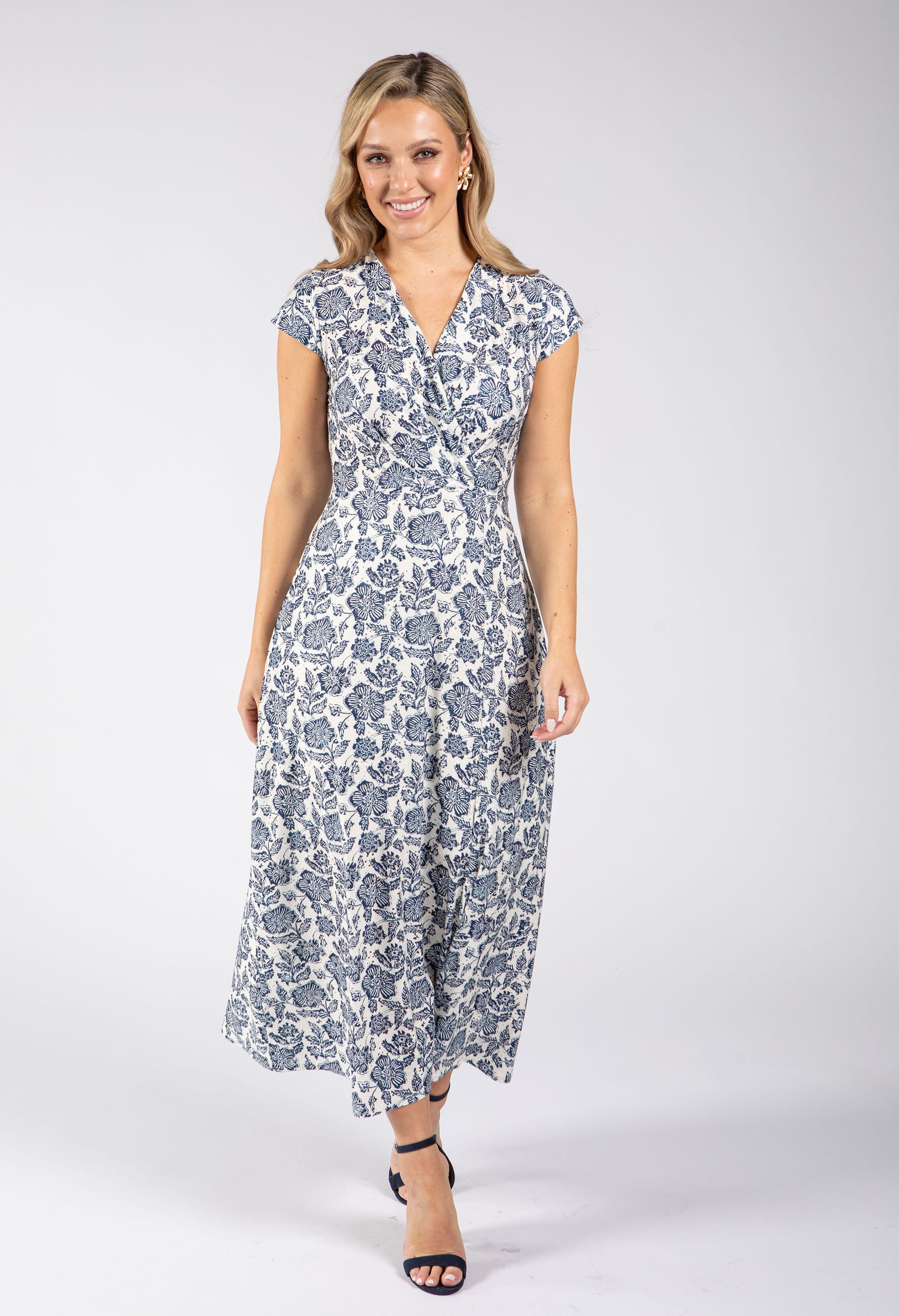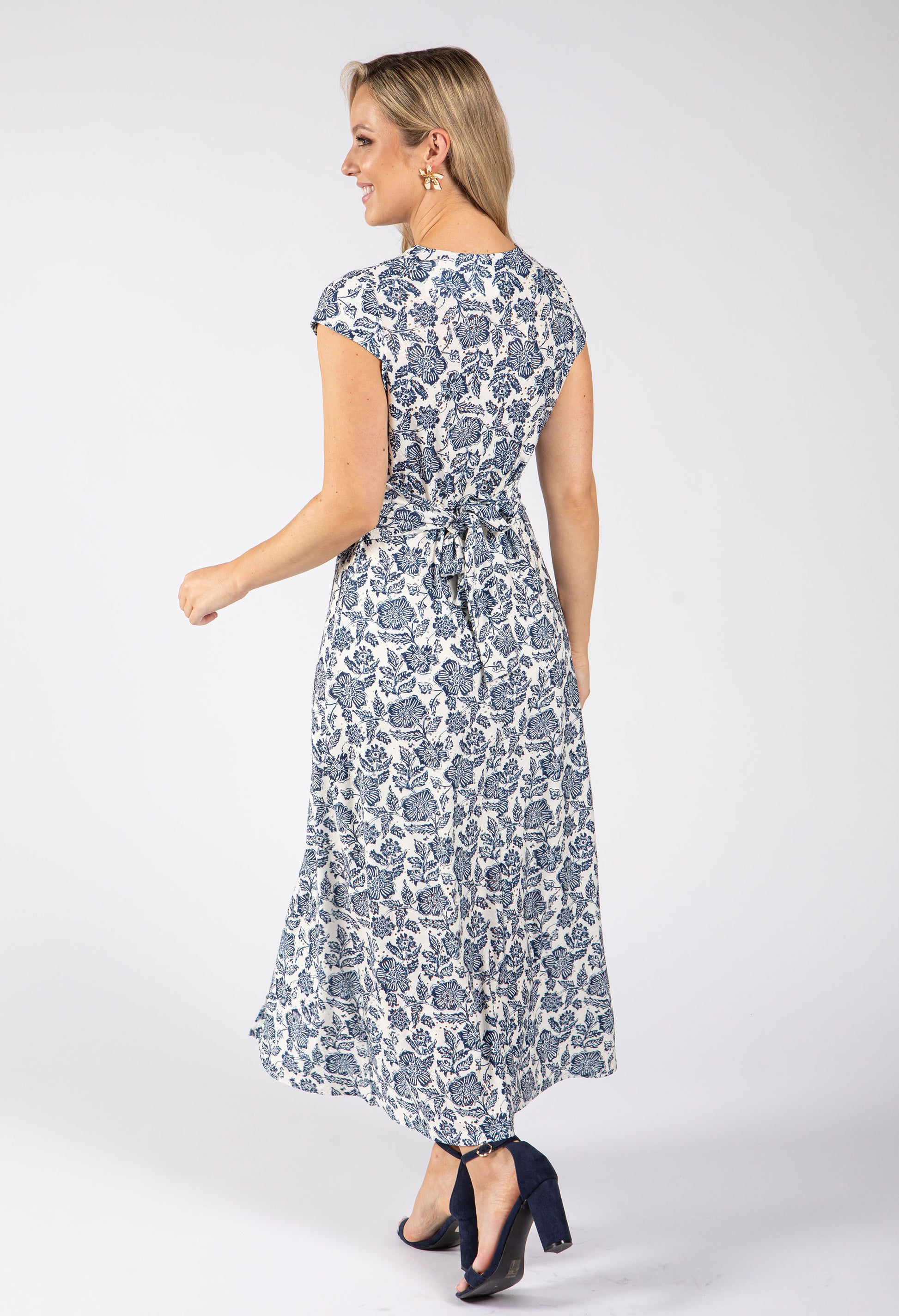 Effortlessly elegant, this floral print midi dress features a flattering faux wrap bodice with tie waist belt for a defined silhouette. The sleeveless V-neckline and delicate broderie anglaise effect add feminine charm, while the stretch material ensures comfortable all-day wear. Perfect for occasions that call for understated sophistication.