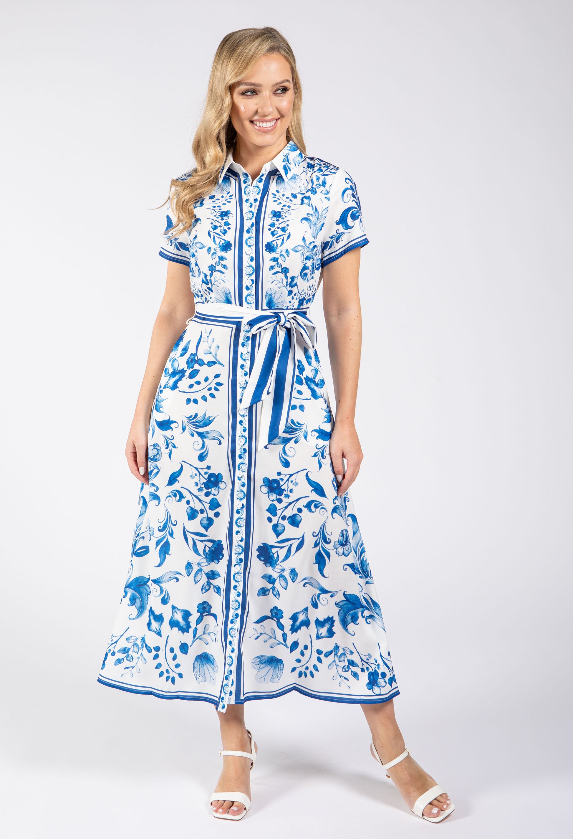 Style and comfort unite in this leaf print shirt dress with a classic collared neckline and button front. The tie waist belt accentuates your figure, while side pockets offer practical convenience. Perfect for weekend wear, this midi-length dress brings effortless elegance to any occasion.