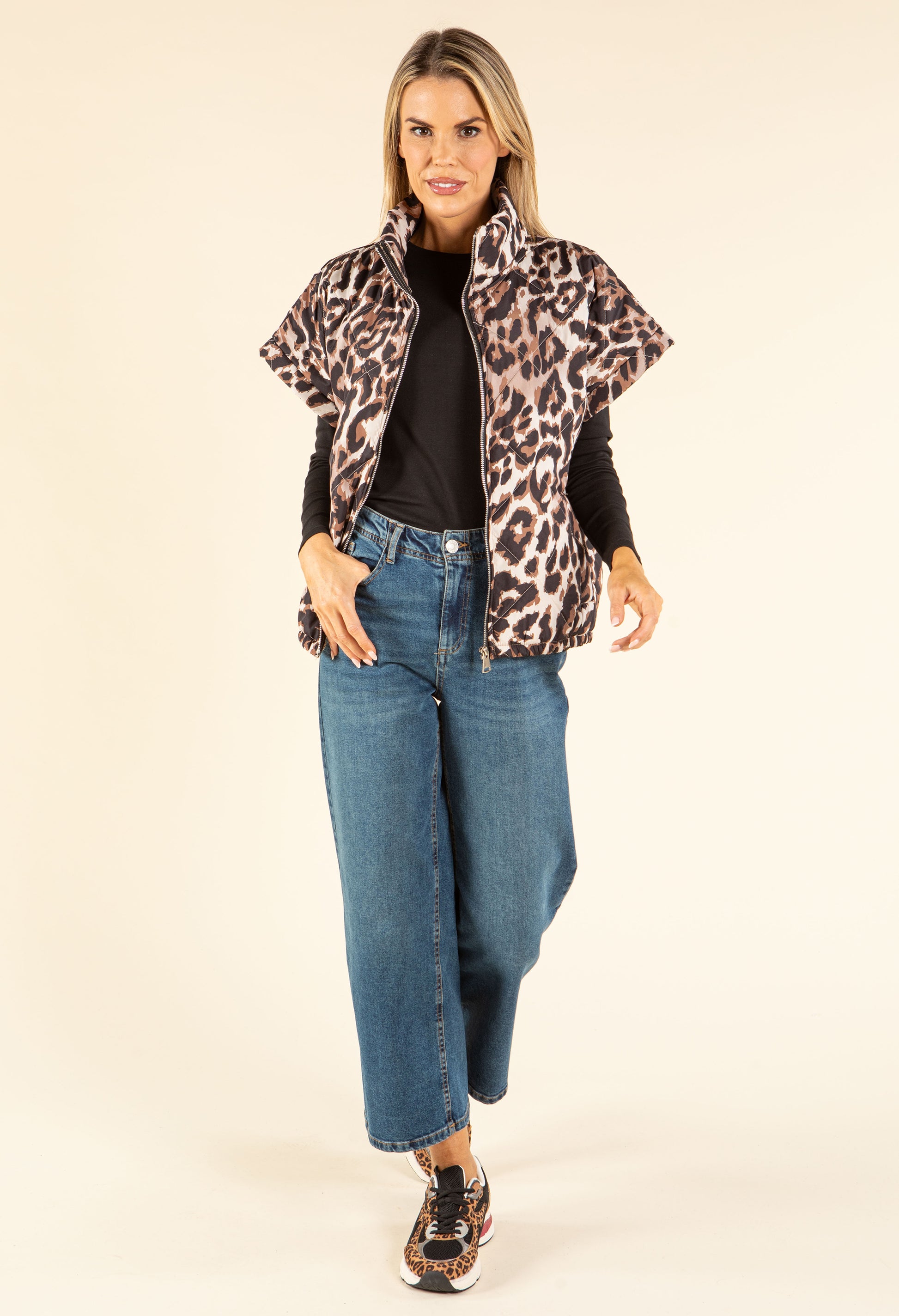 This quilted gilet is designed with a turn-up collar and a zip-up front. It features open side pockets, cap sleeves, and an elasticated waistband, all accented with refined silver hardware for a polished look.