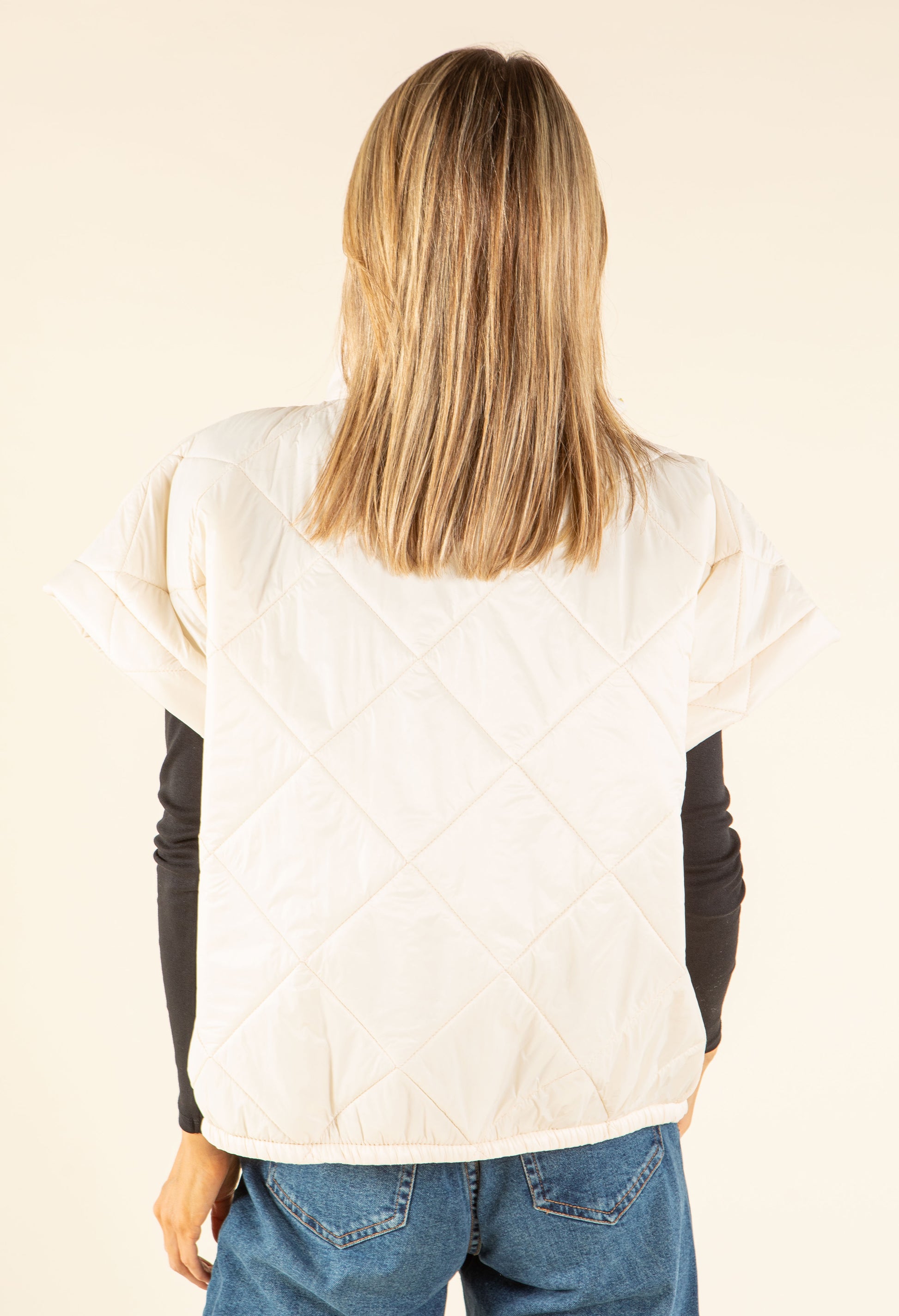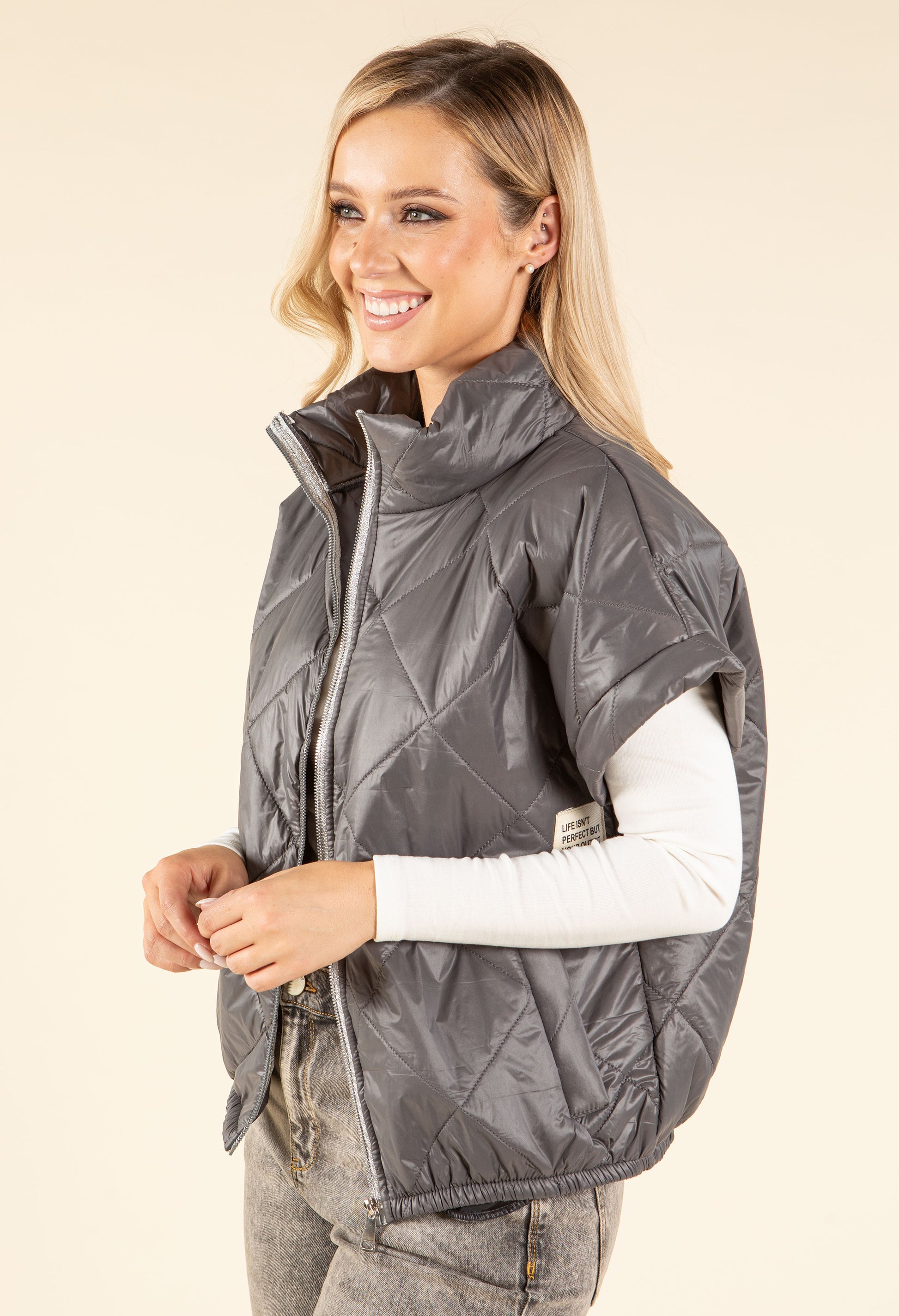 This lightweight quilted gilet features a turn-up collar and zip-up closure. It includes an elasticated waistband, cap sleeves, and open side pockets, combining practicality with a refined design.