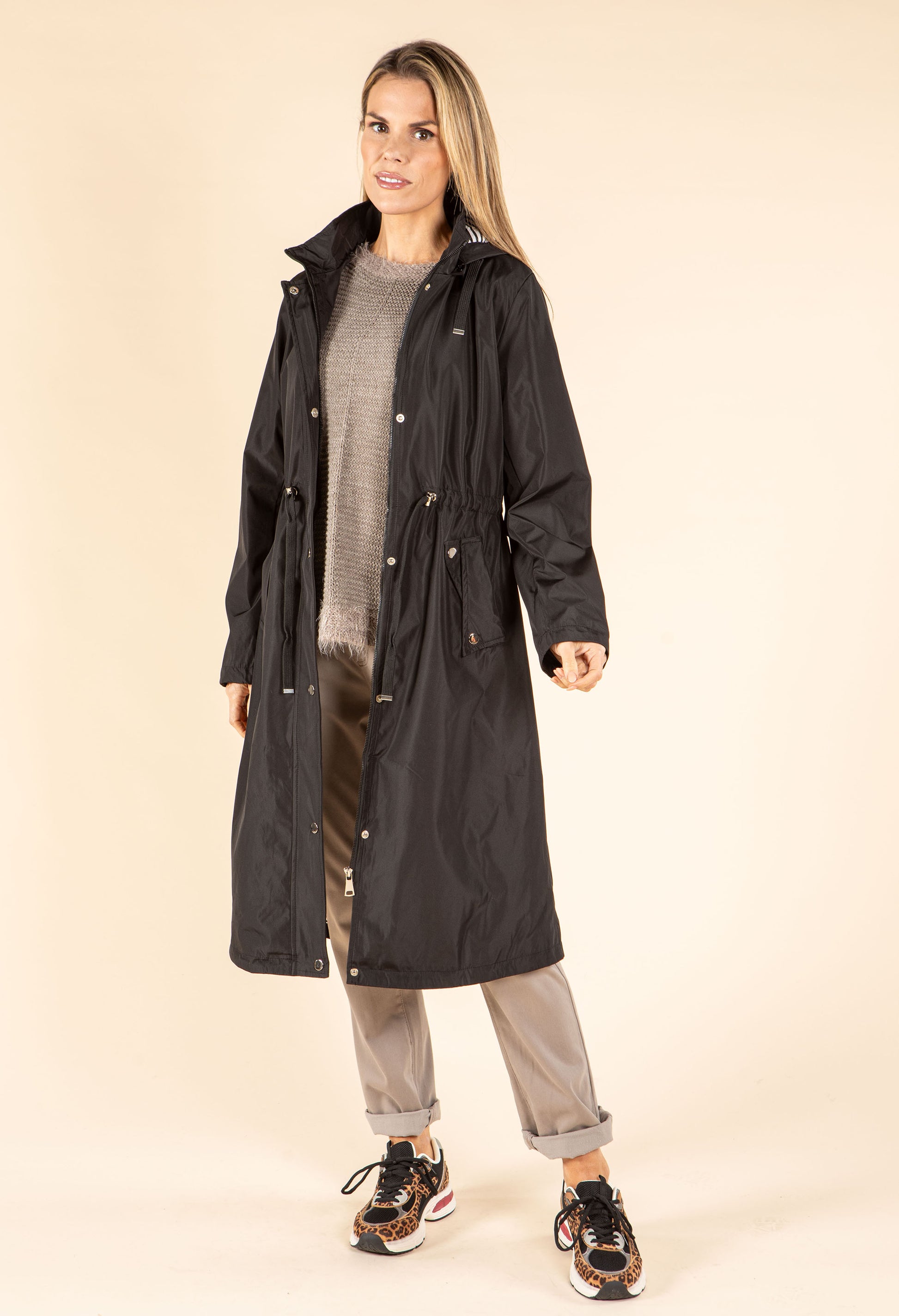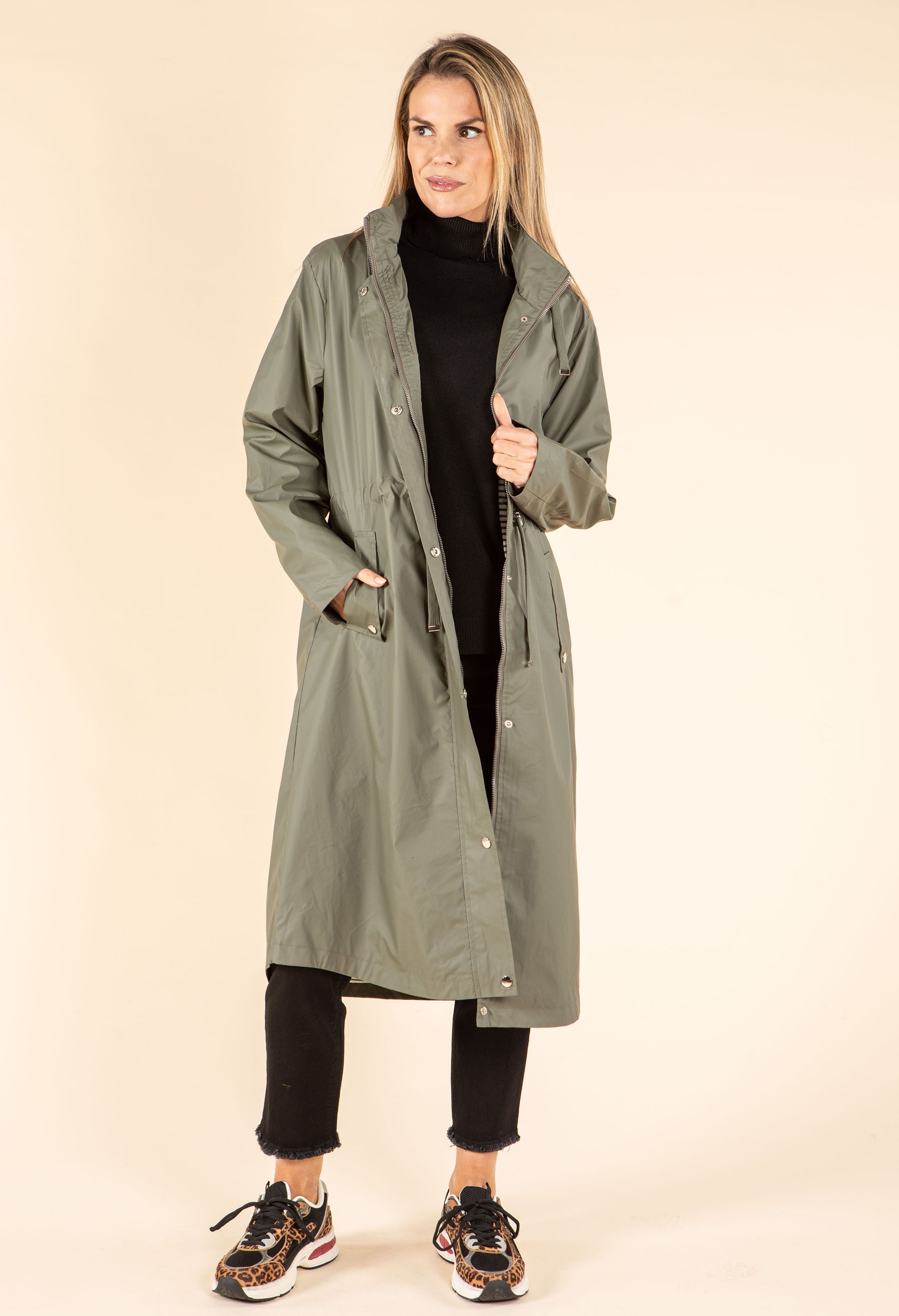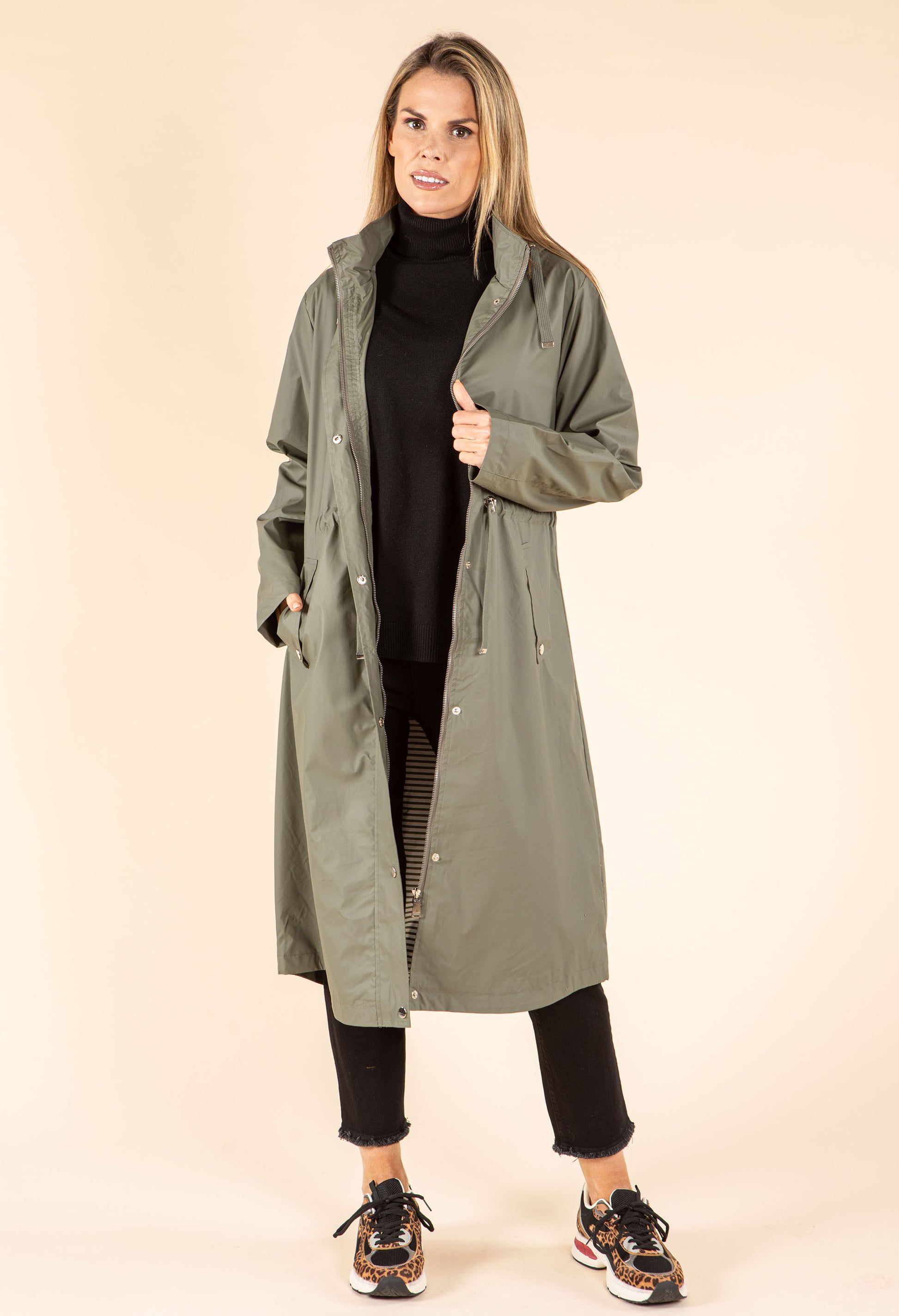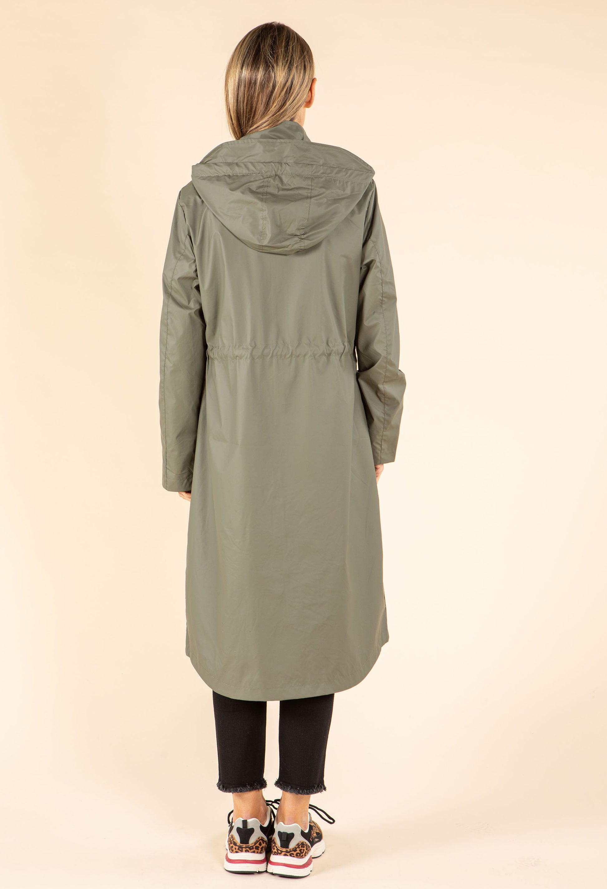 This Rain Jacket features a button and zip front, a removable hood, and convenient side pockets. The waist and hood have adjustable drawstrings, and the coat is fully lined for added comfort.