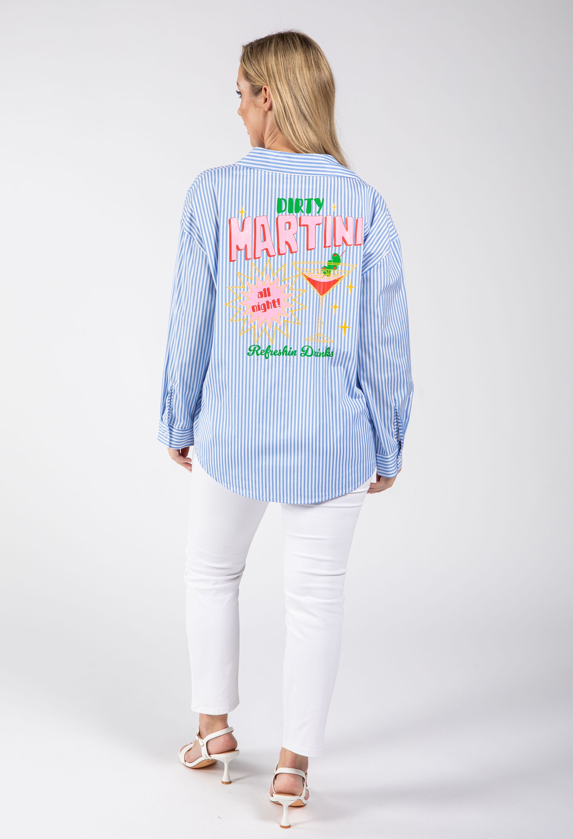 Elevate your casual wardrobe with this charming Martini Striped Shirt. Featuring a classic striped print paired with playful "Dirty Martini" details, this piece combines style with personality. The collared neckline, long sleeves with buttoned cuffs, and relaxed fit create an effortlessly polished look perfect for everyday wear. Button closure and rounded hemline complete the design.
