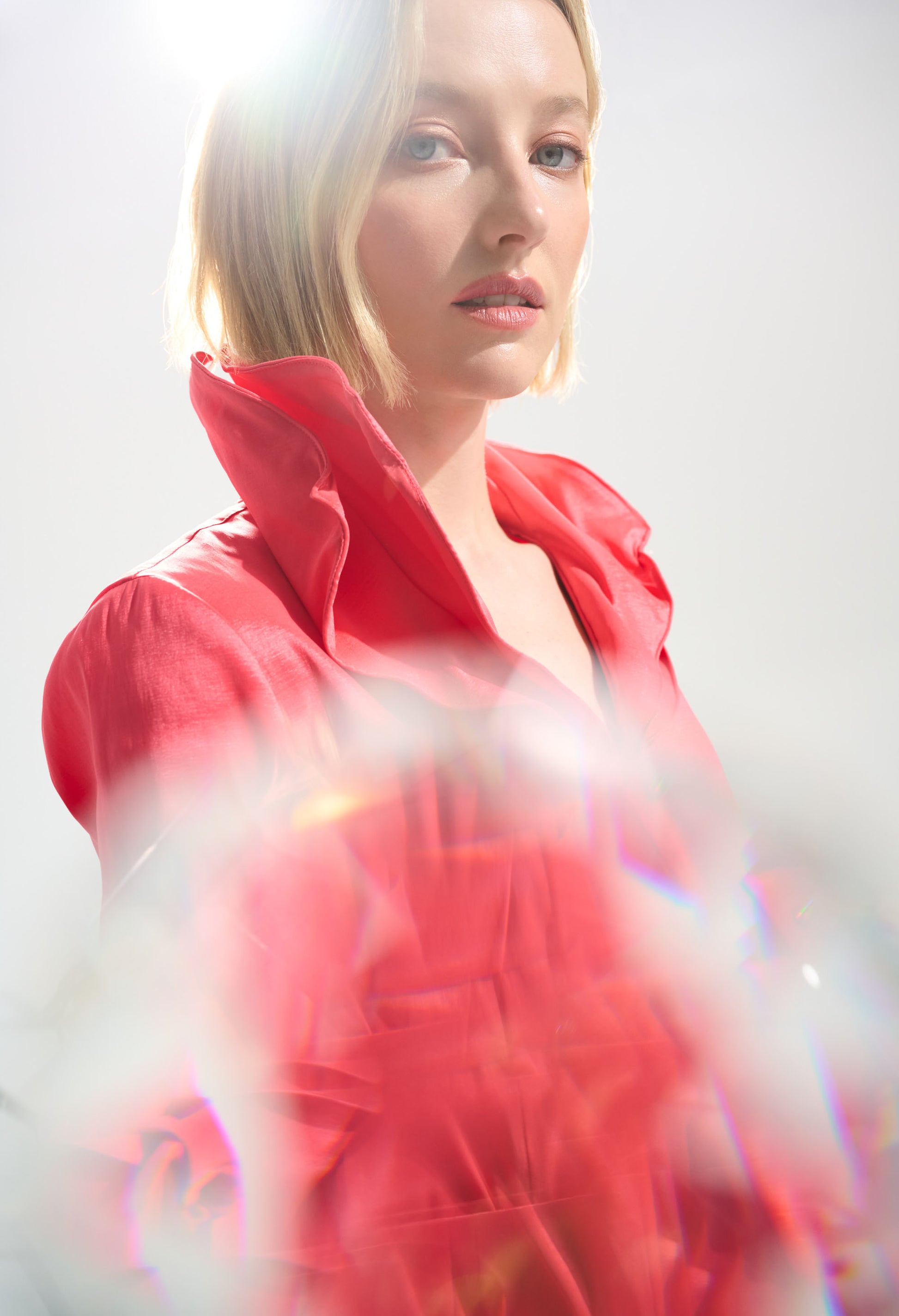 This midi-length wrap dress features a sophisticated collared neckline and stylish 3/4 straight sleeves. Accentuated by a belt, its plain pattern and feminine style make it a versatile addition to any wardrobe. Perfect for various occasions, this dress promises both comfort and class.