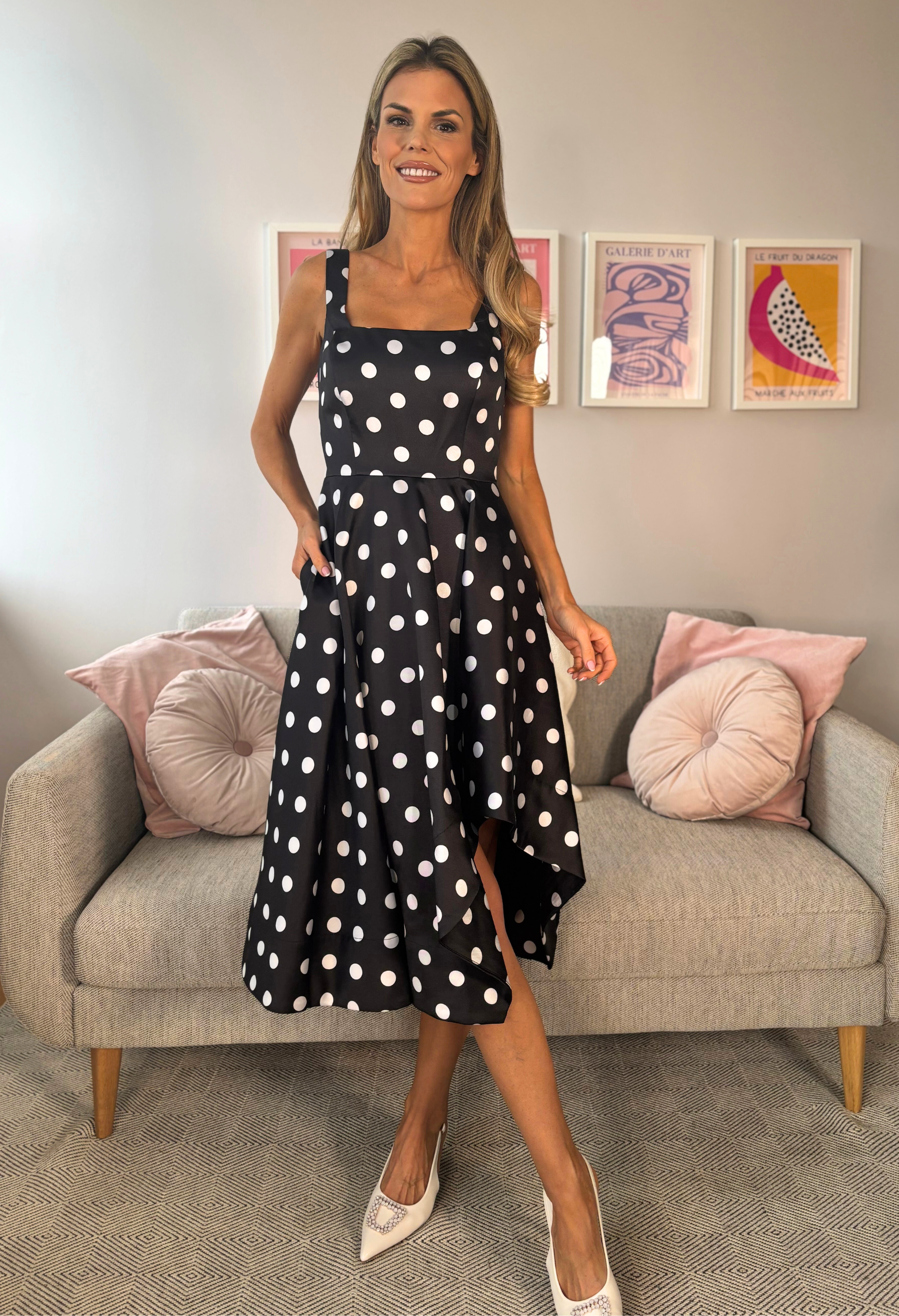 This charming polka dot midi dress combines style with everyday practicality. The sleeveless design and square neckline create a contemporary silhouette, while the luxurious satin-touch fabric feels wonderful against your skin. Lined throughout for comfort and confidence, it features handy side pockets for convenience. The back zip closure ensures an easy fit.