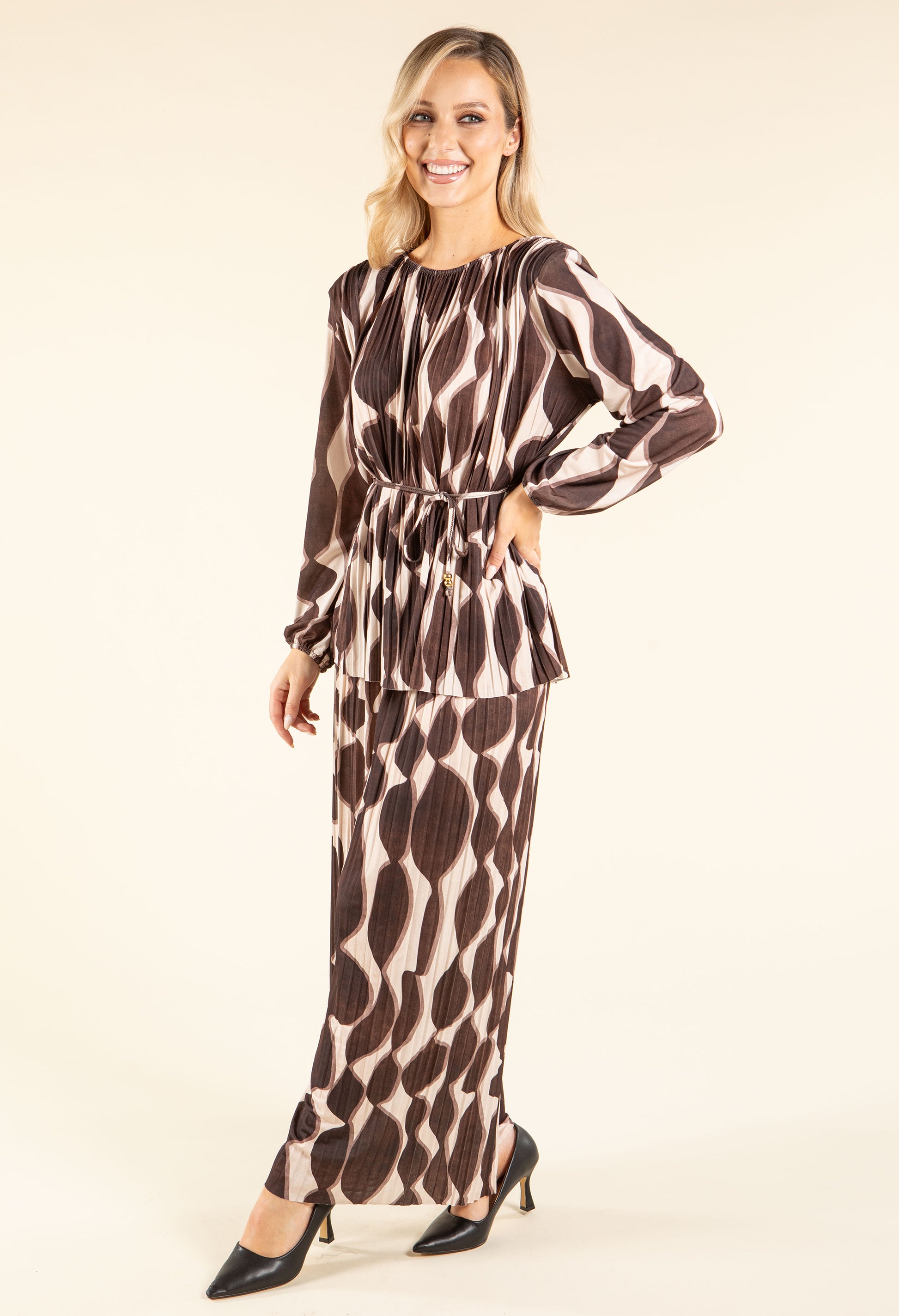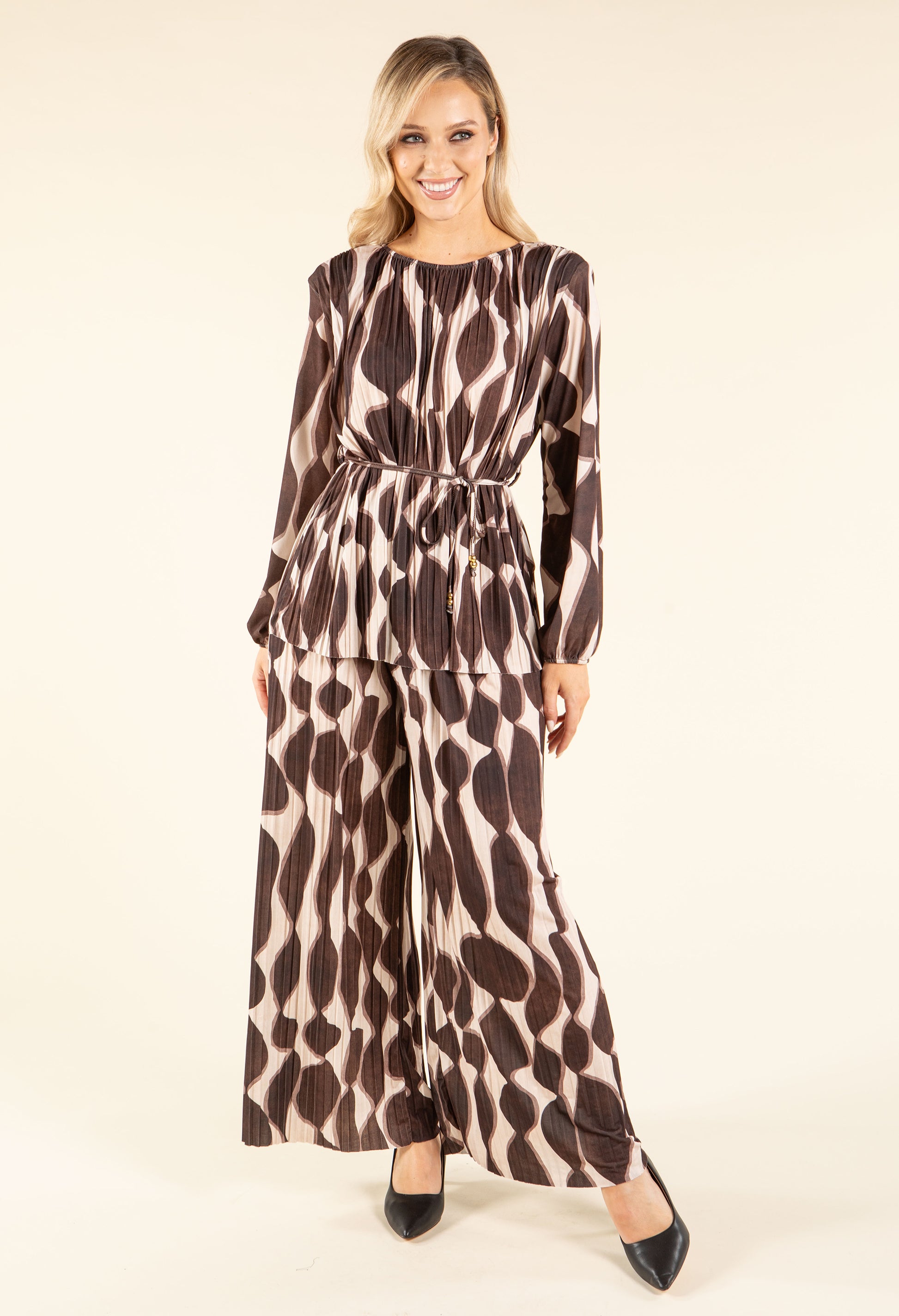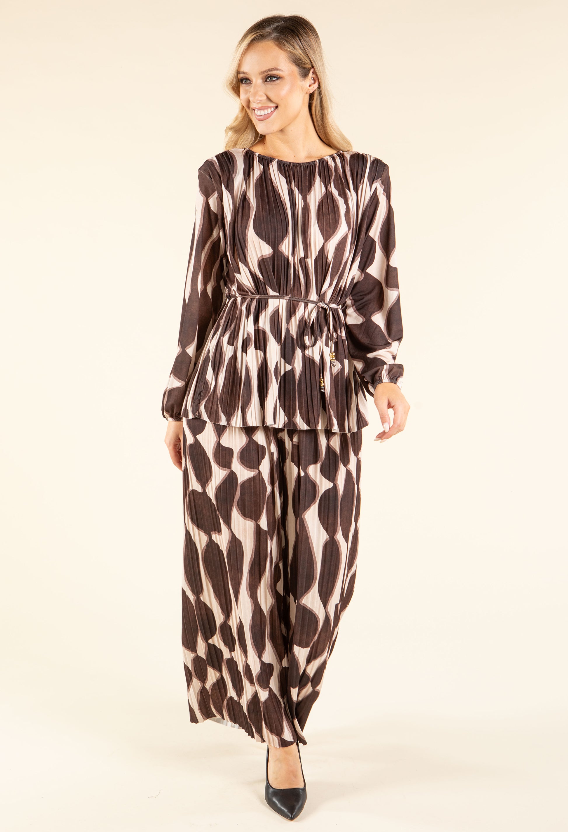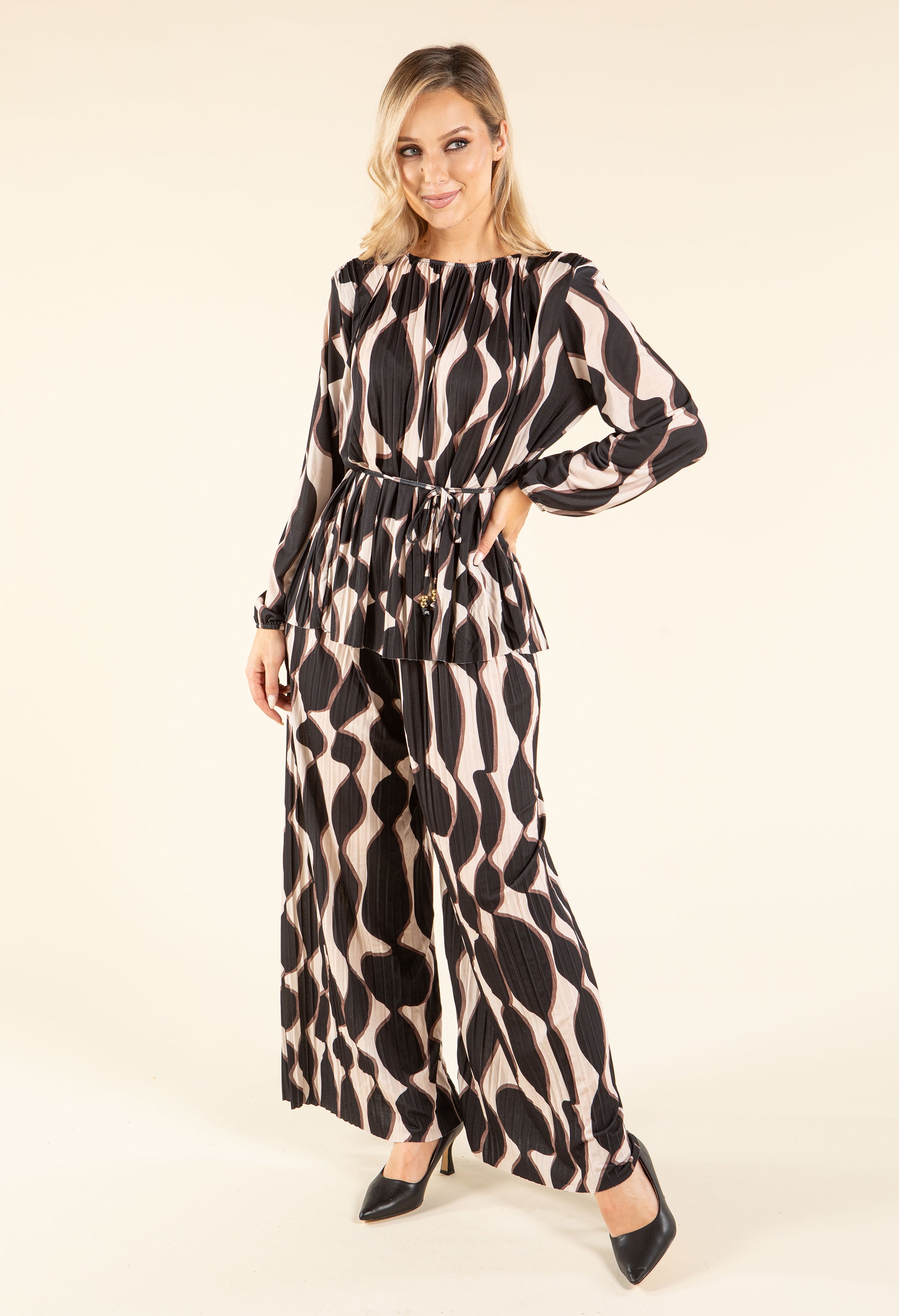 This set features a blouse and wide-leg trousers with long sleeves, shoulder pads, and a belt. The trousers have an elasticated waistband and a retro print, all crafted in plisse pleated fabric. Available in a free size, it's a stylish and comfortable co-ord perfect for adding a modern touch to your wardrobe.