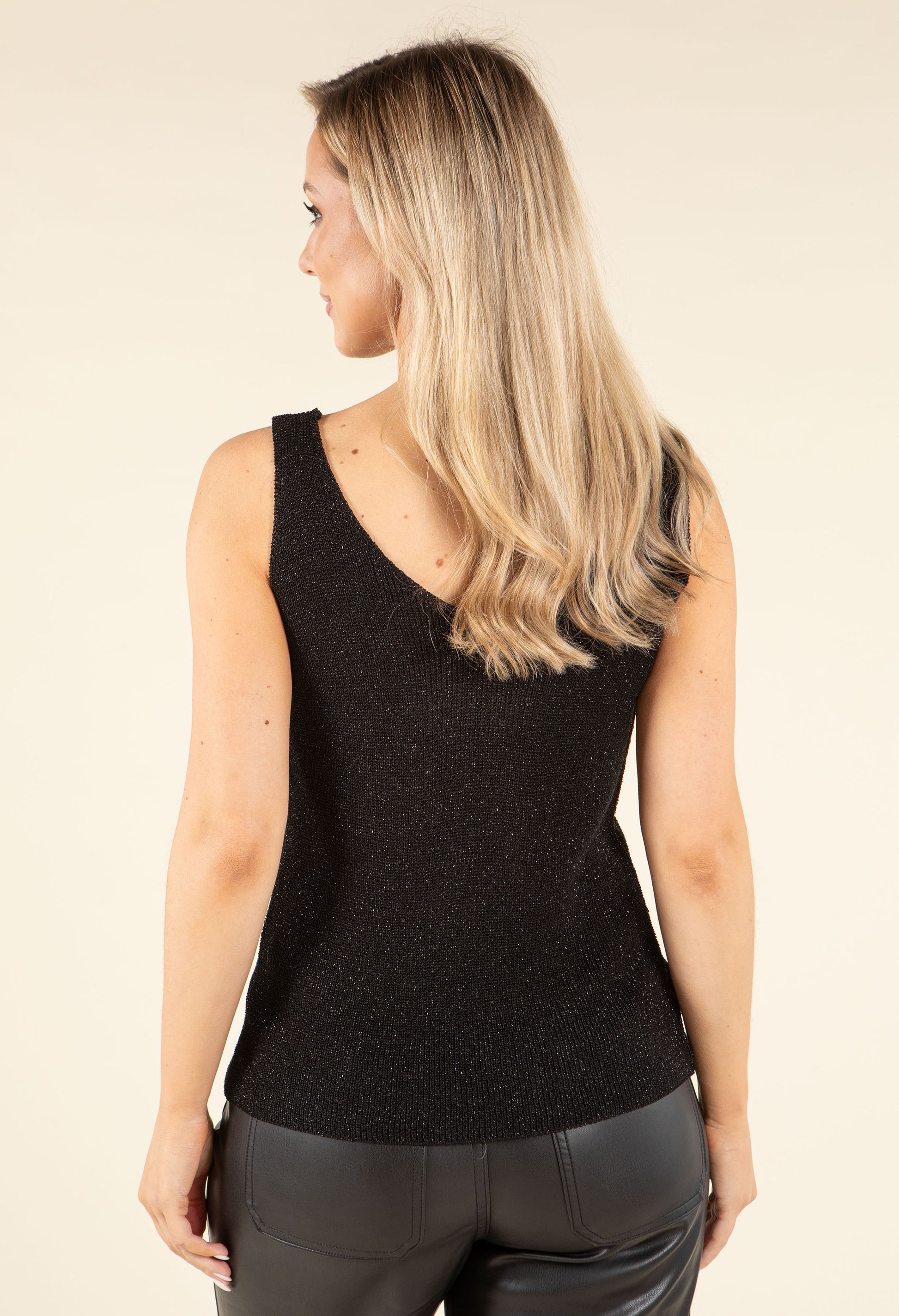 Be prepared to dazzle in this elegant Sleeveless Lurex Knit Top, featuring a trendy V-neckline and a comfortable, one-size-fits-all design.