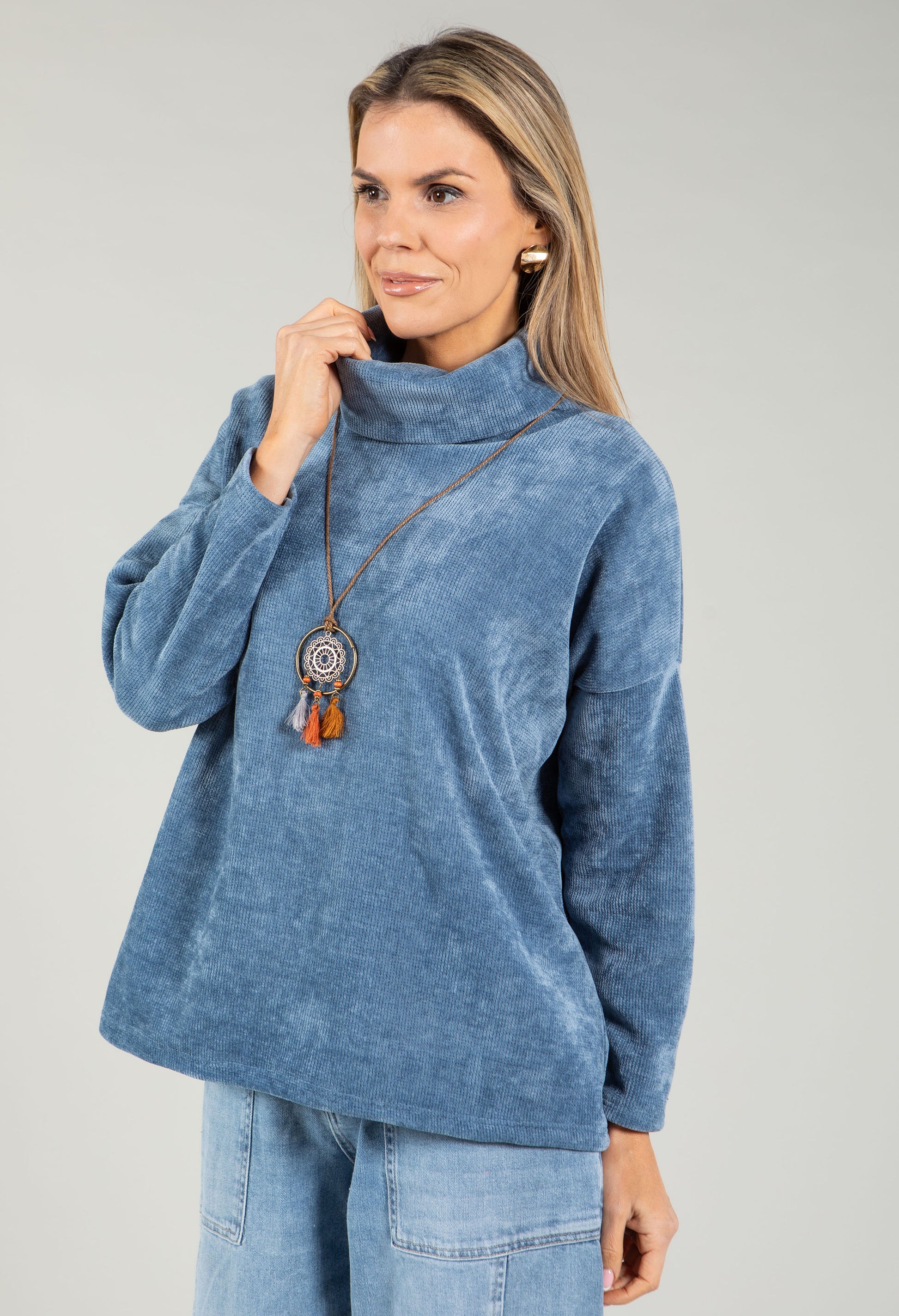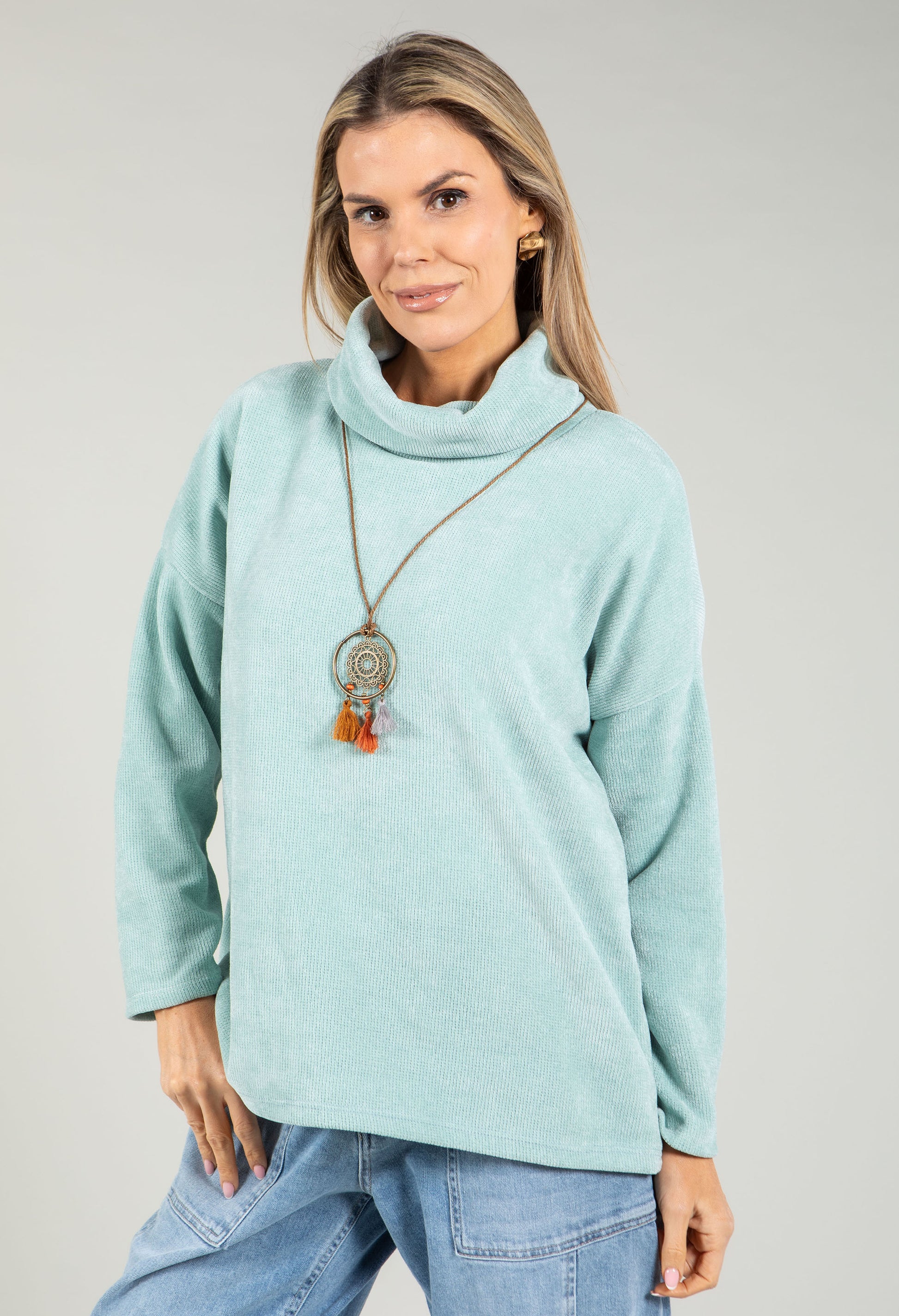 Featuring a cosy roll neckline and long sleeves, this relaxed-fit jumper delivers effortless comfort in a soft touch fabric. The included pendant adds a stylish finishing touch, making it perfect for layering or wearing solo. Ideal for everyday wear that feels as good as it looks.