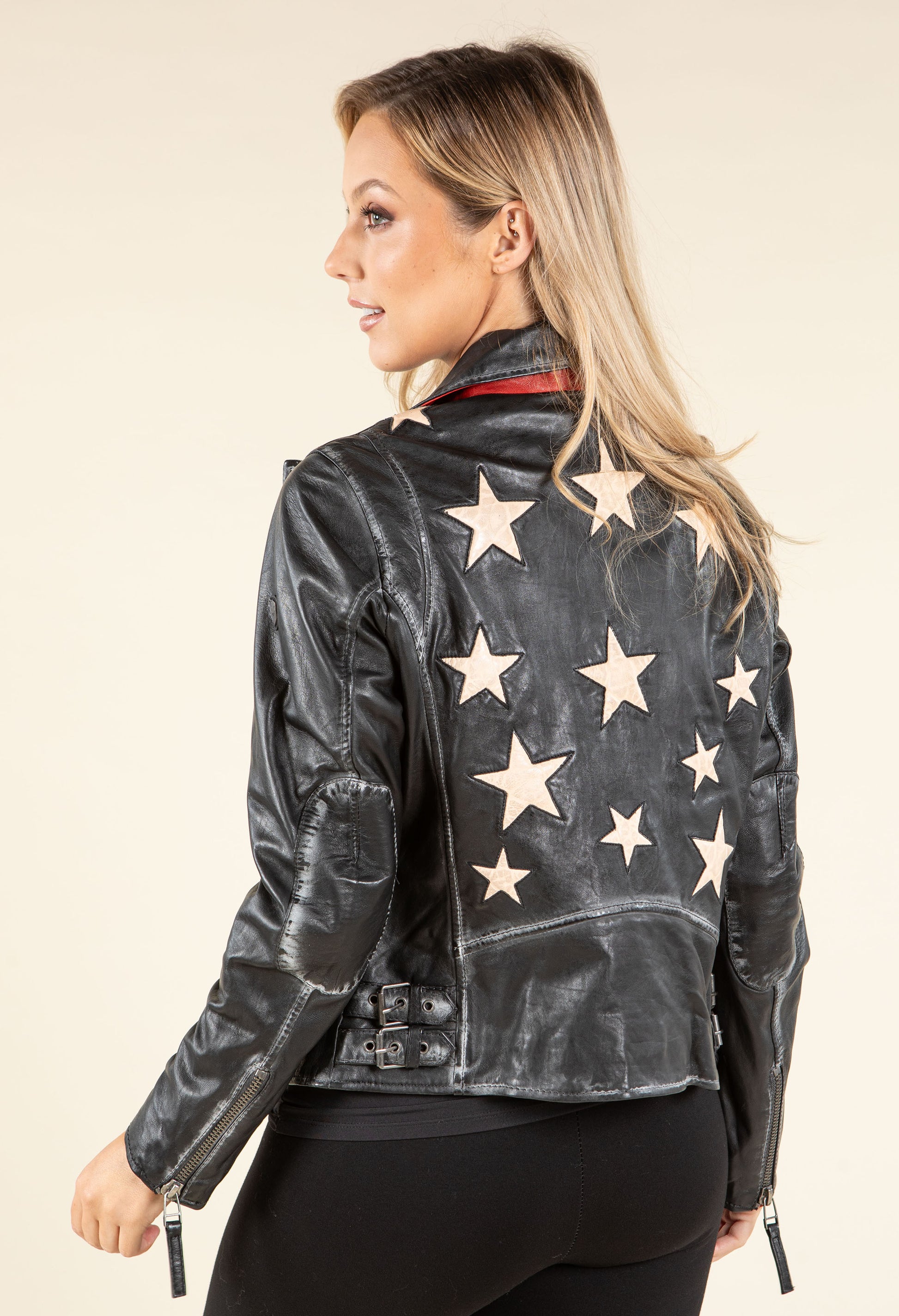 This real leather biker jacket features an asymmetrical zip-up closure, zippered side pockets, and a inside pocket for secure storage. Belt loops on the waistband provide a tailored fit, while the accentuated elbow area and back sleeve zippers add functional style. Star detailing enhances its distinctive look, and the jacket is fully lined for comfort.